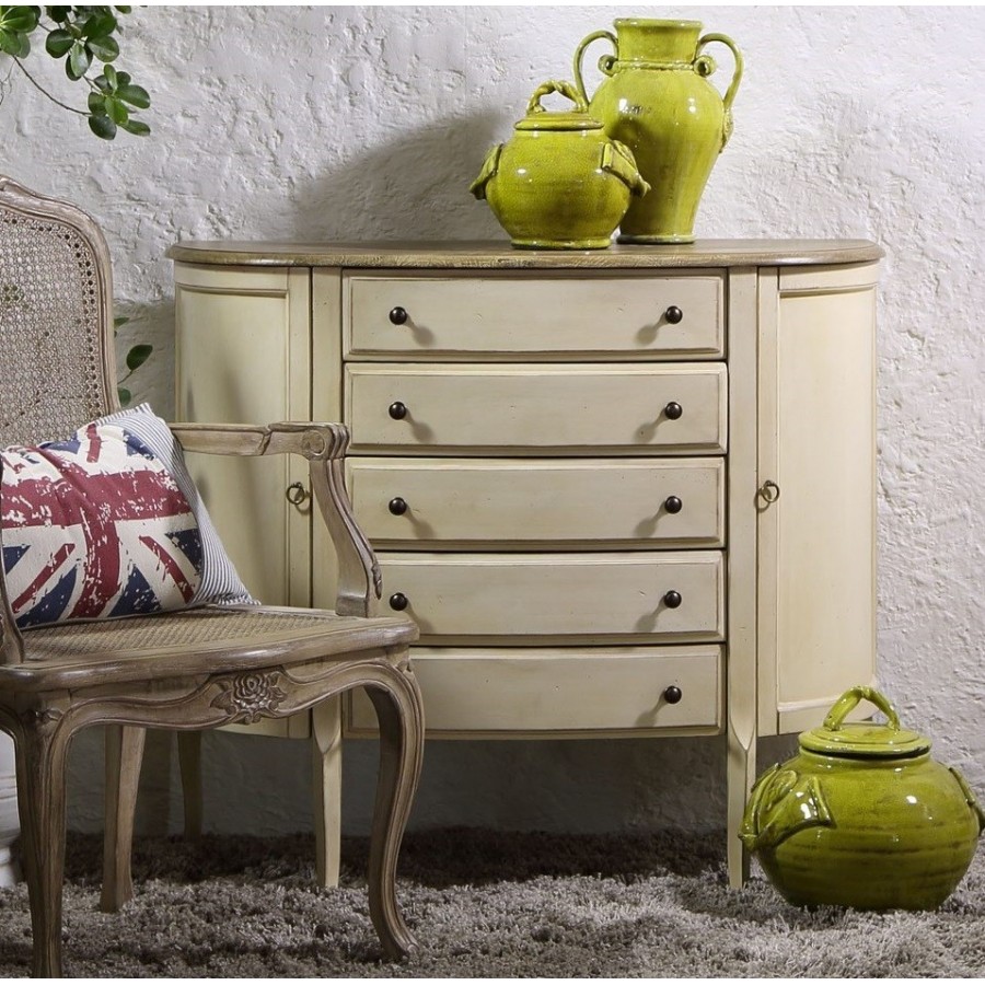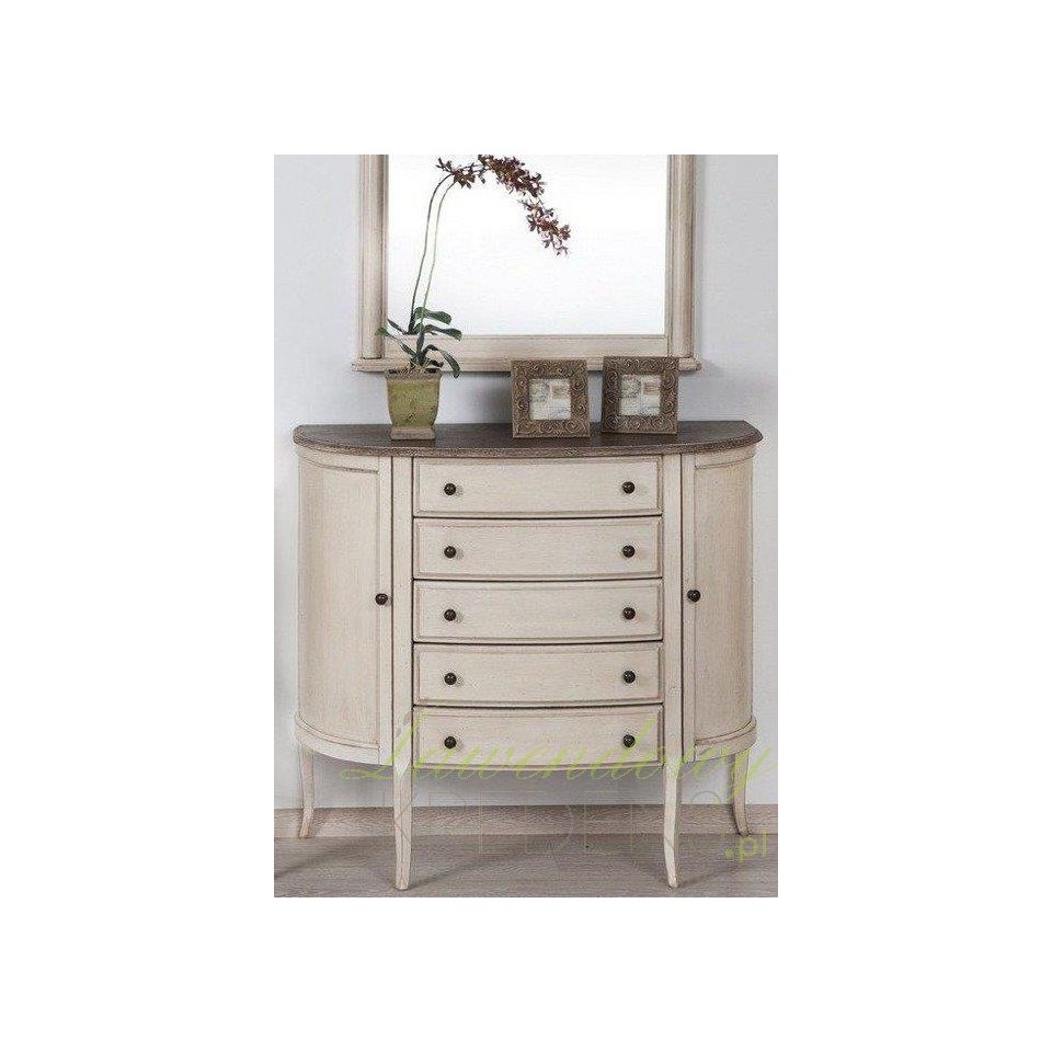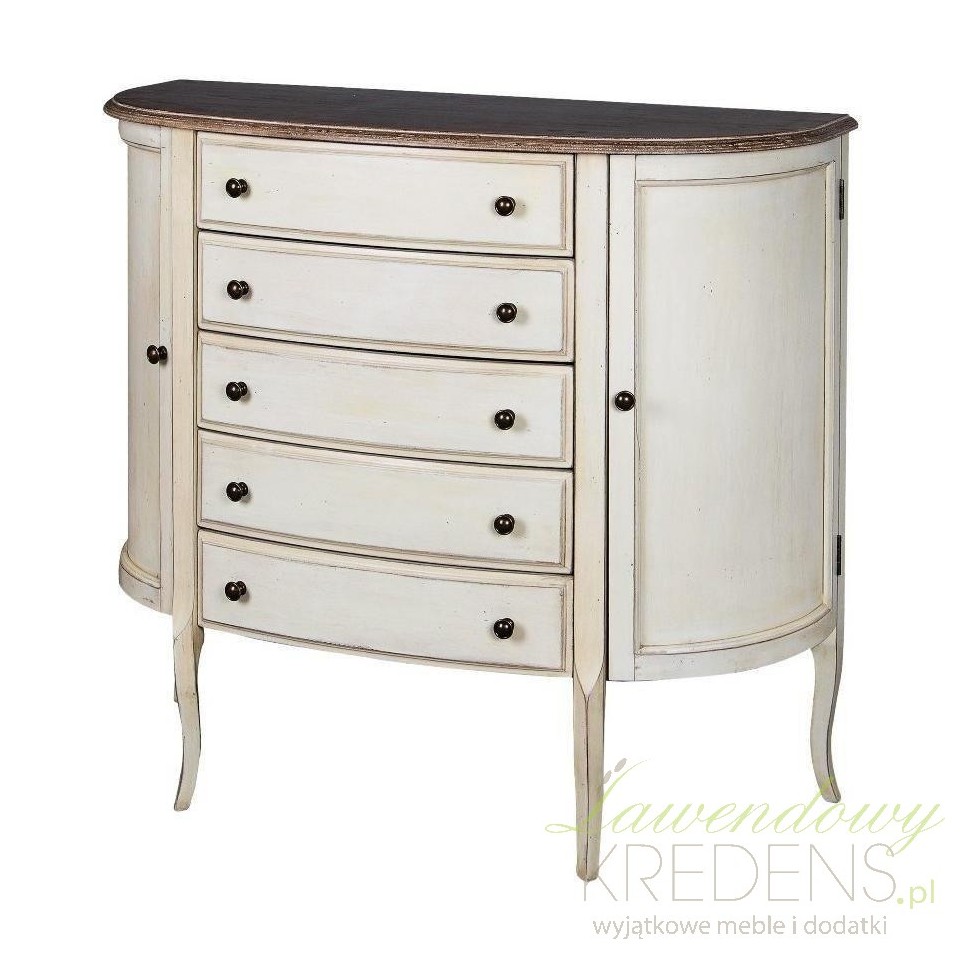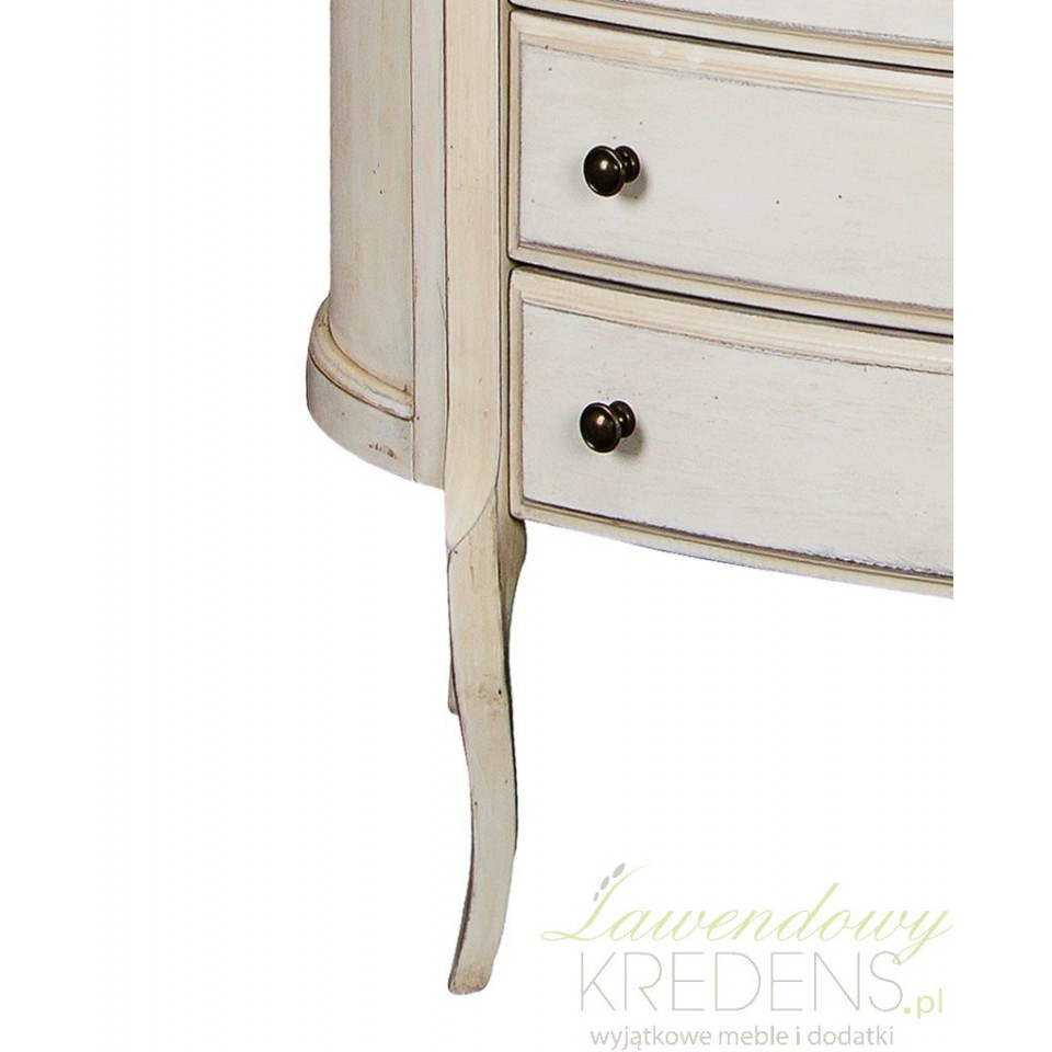 Olśniewająca komoda prowansalska o ciekawym, zaokrąglonym kształcie i pojemnych szufladach w kolorze kości słoniowej.