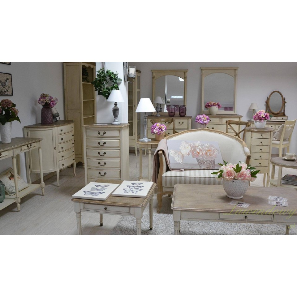 Komoda w stylu prowansalskim wykonana z drewna to bosko wyglądający mebel w kolorze beżowym. Komoda posiada nietypowe kształty – jest zaokrąglona po bokach, w centralnej części natomiast umieszczono ciąg prostokątnych szuflad z okrągłymi, czarnymi uchwytami. Ten wyjątkowy mebel z pewnością będzie wyróżniał się na tle innych, z racji na swoją oryginalność i niecodzienny styl. Polecamy inne meble prowansalskie.