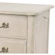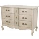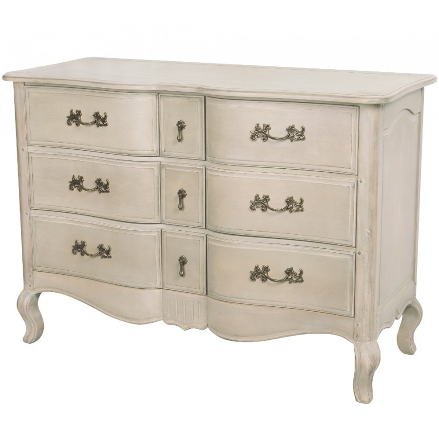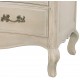 Wsparta na czterech giętych nogach komoda w stylu francuskim utrzymana w jasnej kolorystyce, celowo wybarwiana.