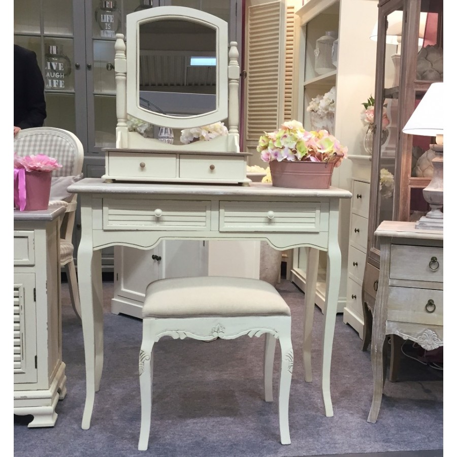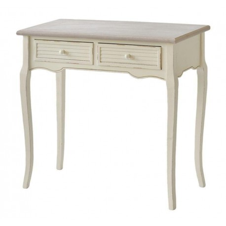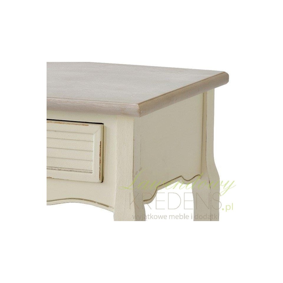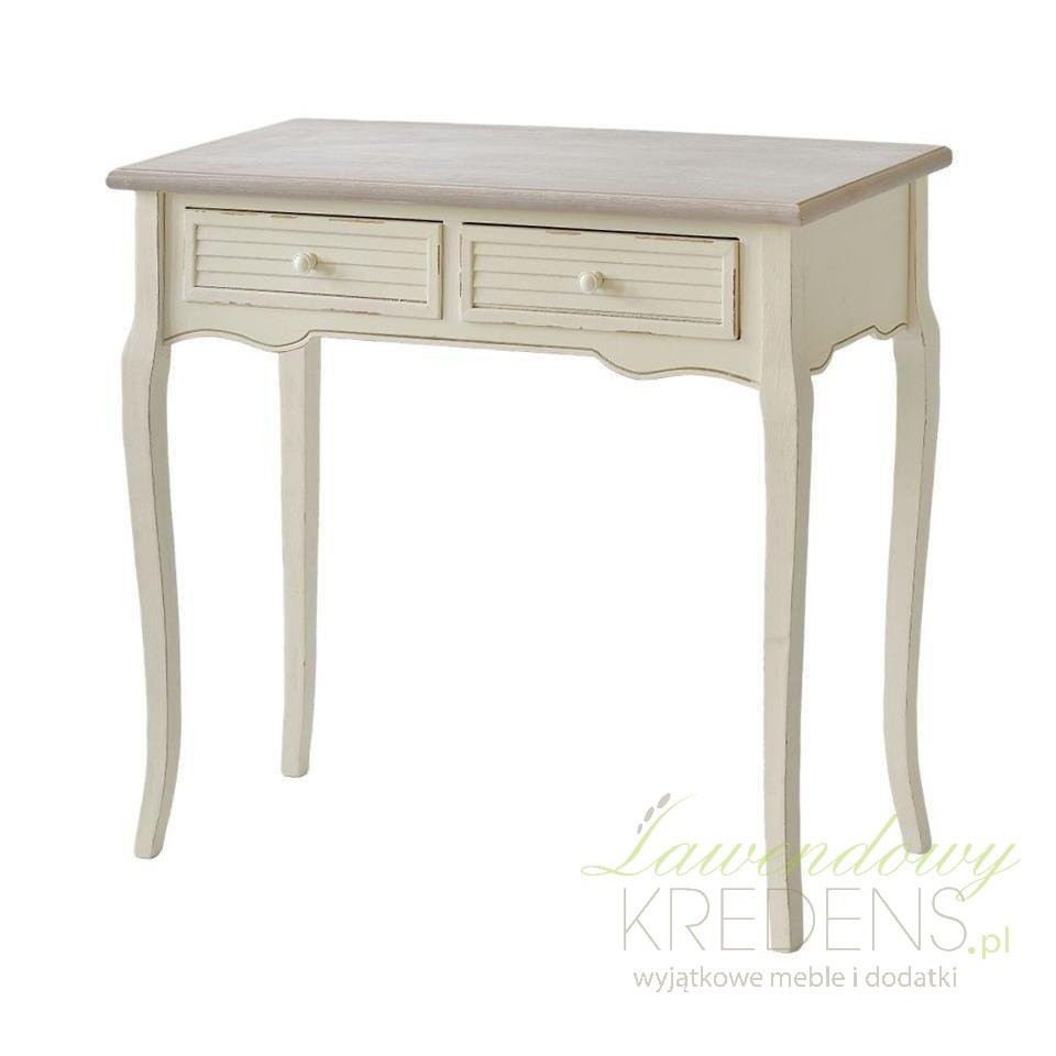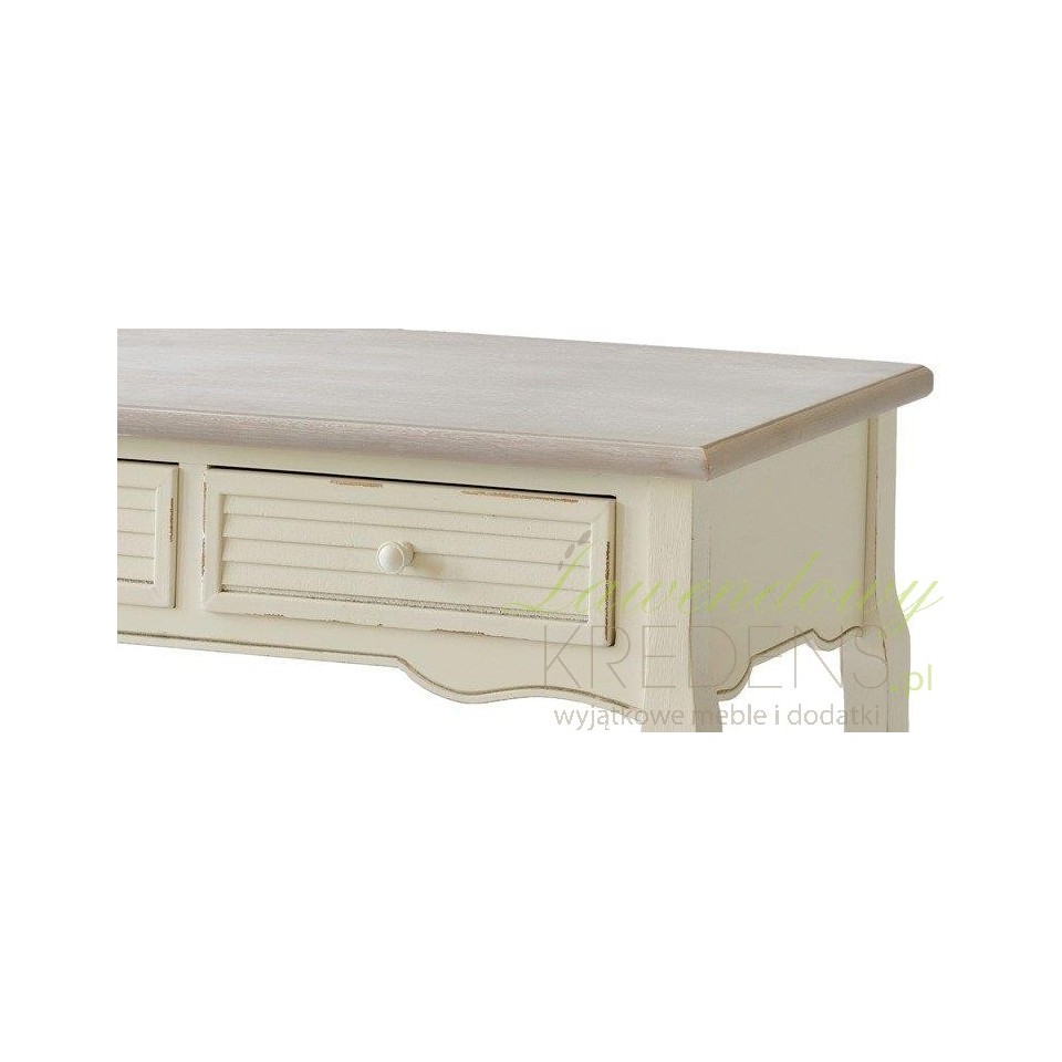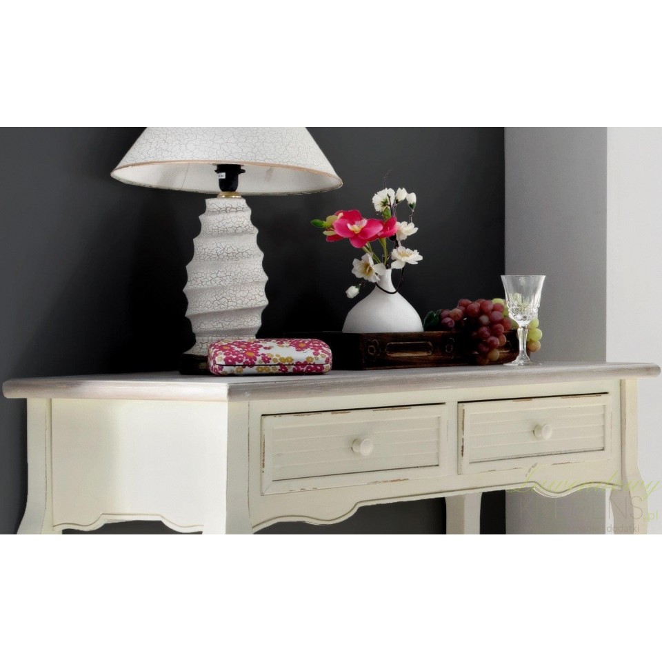 Konsola w stylu prowansalskim z dwiema szufladami i bielonym blatem. Podstawa konsoli ma kremowy kolor z uroczymi przetarciami farby. Konsola świetnie sprawdzi się w przedpokoju, jako biurko w pokoju dziecka czy jako toaletka w sypialni. Można do niej dobrać inne przecierane meble prowansalskie z tej samej serii.
