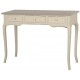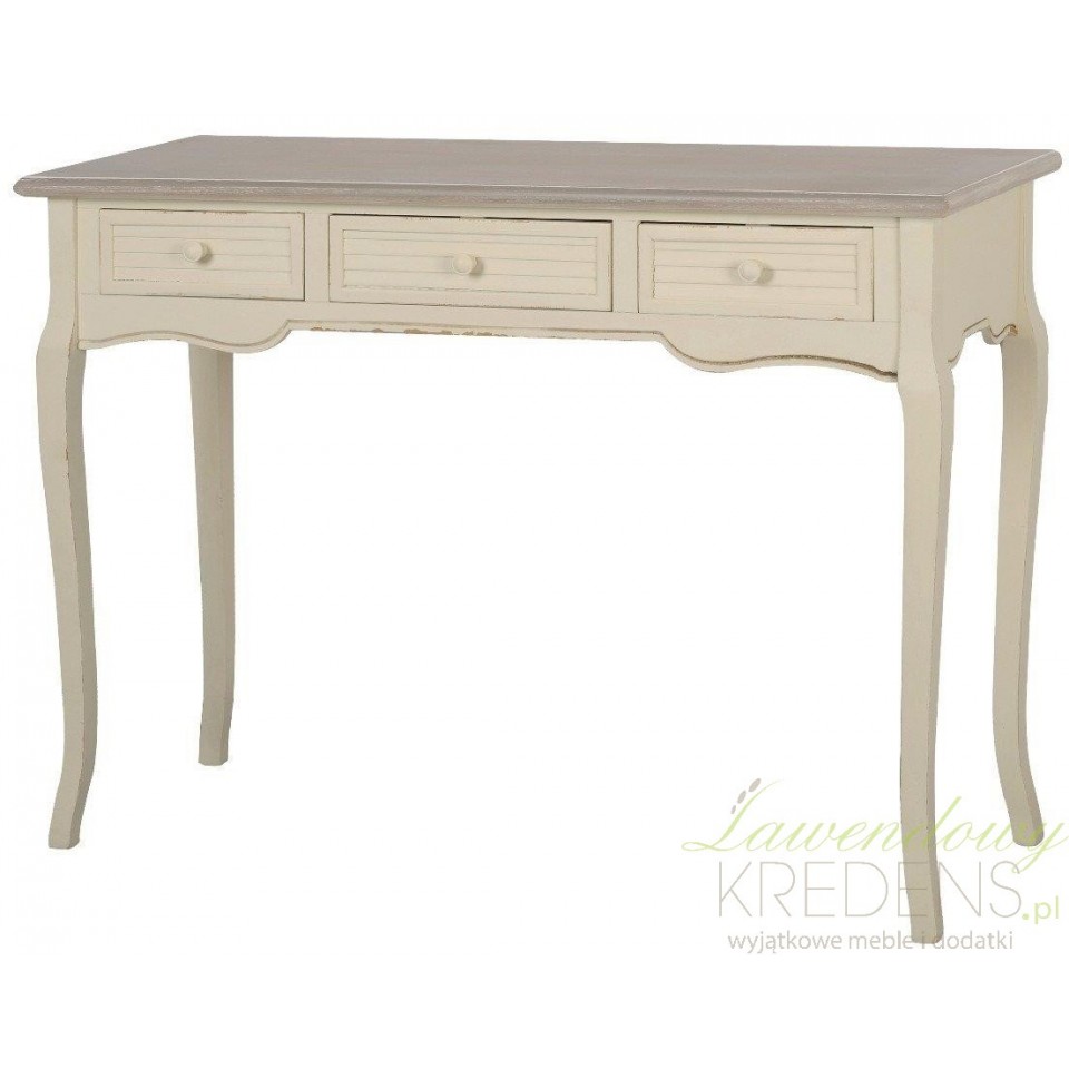 Przepiękna konsola prowansalska z bielonym blatem i trzema szufladami. Podstawa konsoli jest kremowa i uroczo przecierana w stylu shabby chic. Konsola ta jest meblem bardzo uniwersalnym, może sprawdzić się także jako biurko lub toaletka.