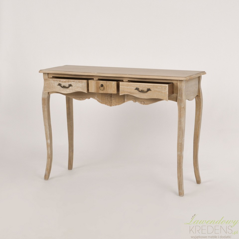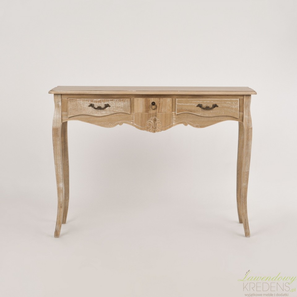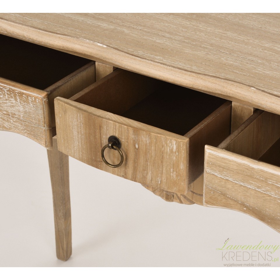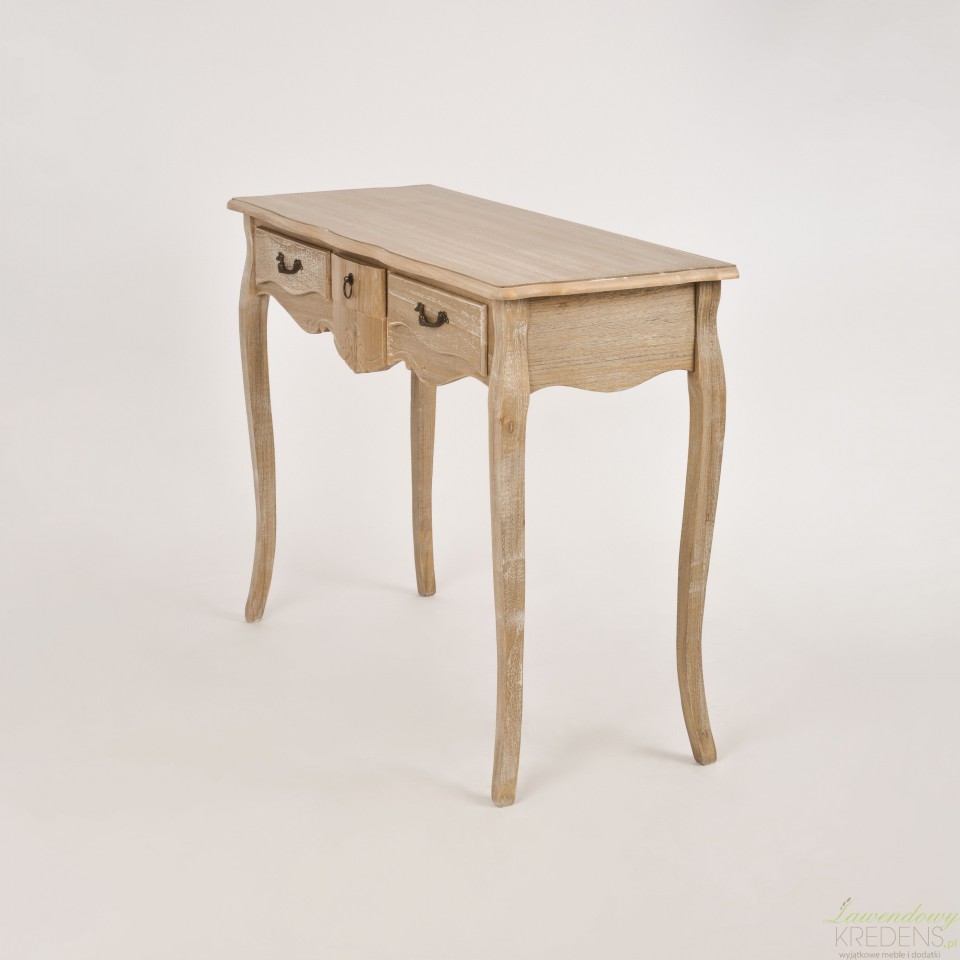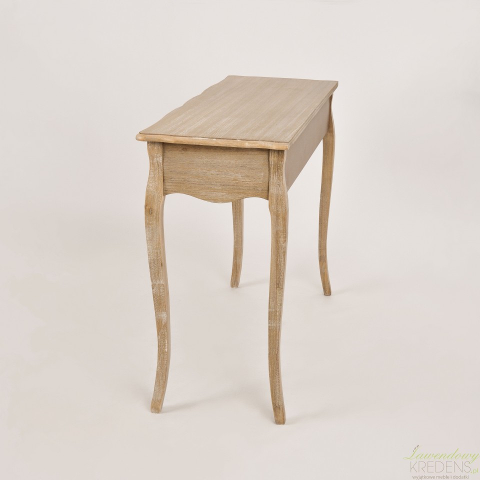 Konosla w stylu prowansalskim wykonana ze szczotkowanego i bielonego drewna topoli z elementami wykonanymi z MDFu. Konsola posiada dwie praktyczne szuflady, dzięki czemu świetnie sprawdzi się nie tylko jako dodatkowy mebel w salonie czy przedpokoju, ale także jako toaletka czy biurko.