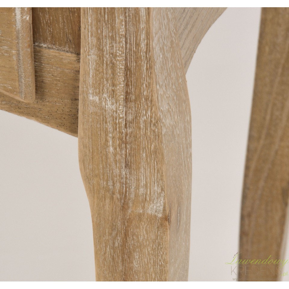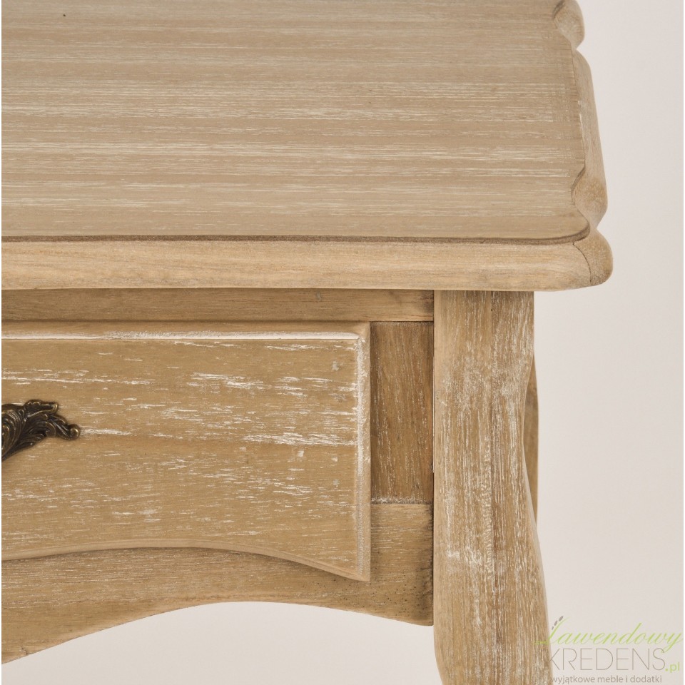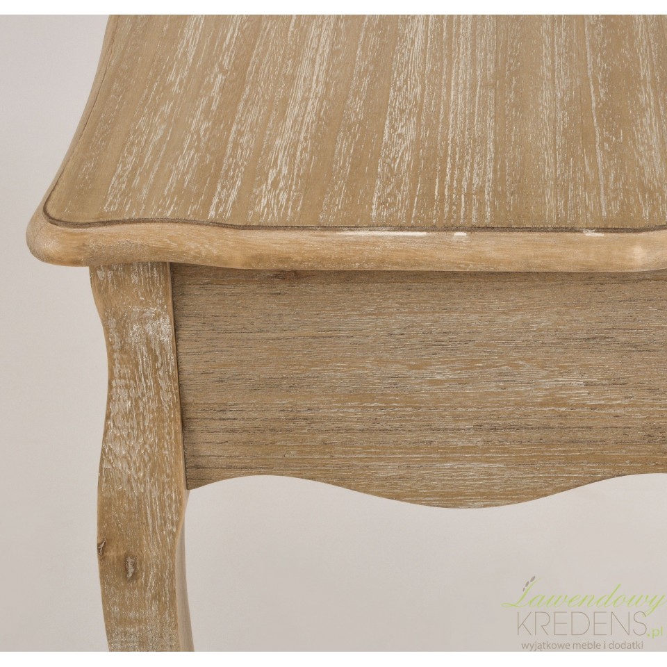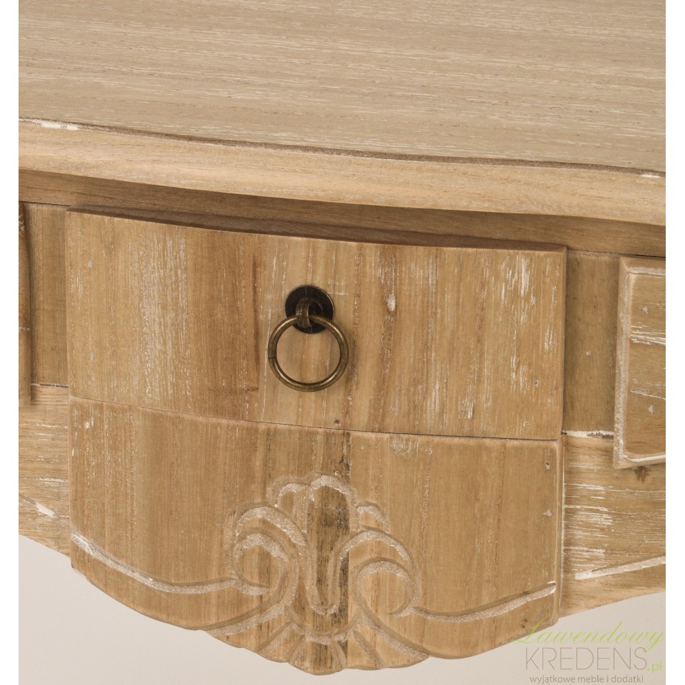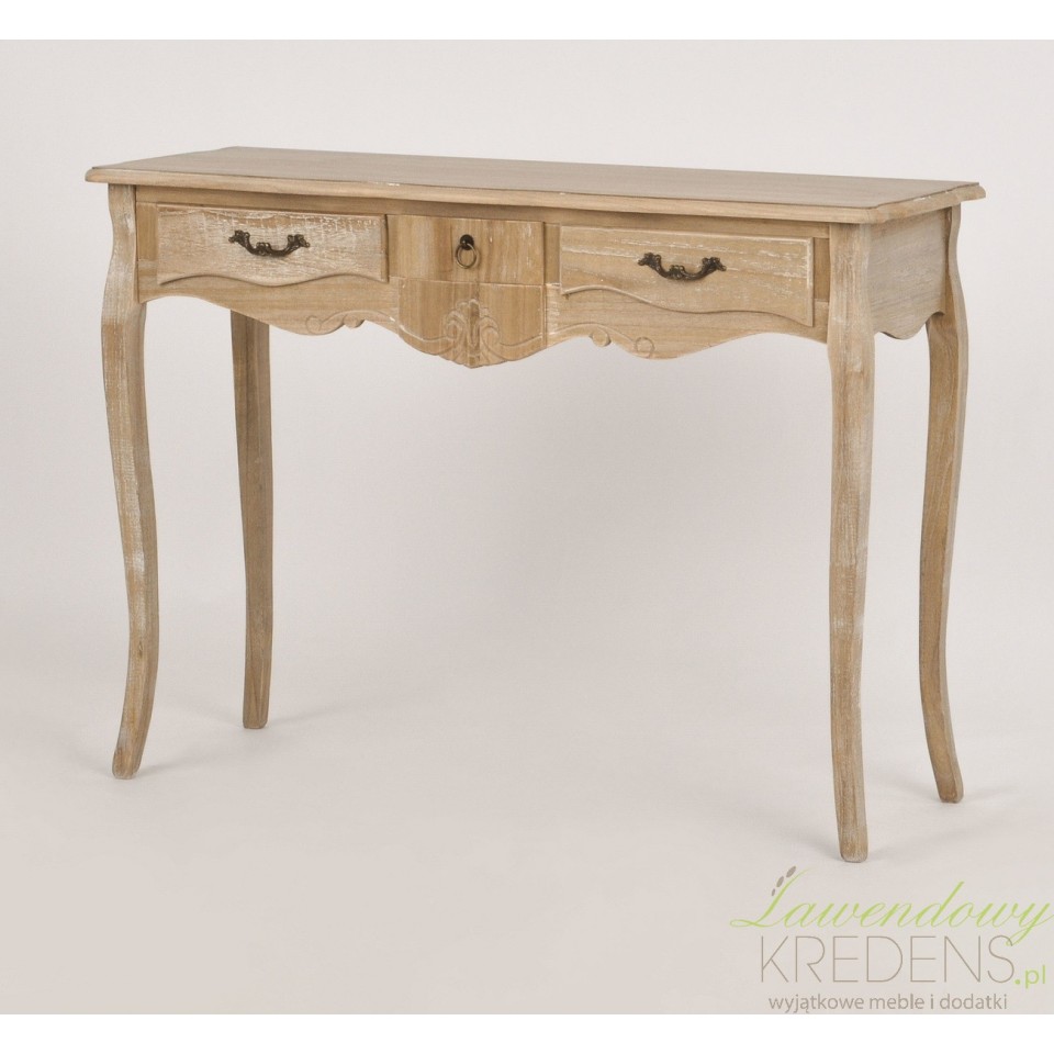 Konosla w stylu prowansalskim wykonana ze szczotkowanego i bielonego drewna topoli z elementami wykonanymi z MDFu. Konsola posiada dwie praktyczne szuflady, dzięki czemu świetnie sprawdzi się nie tylko jako dodatkowy mebel w salonie czy przedpokoju, ale także jako toaletka czy biurko.