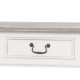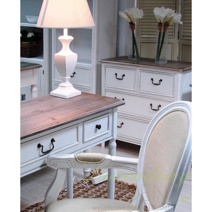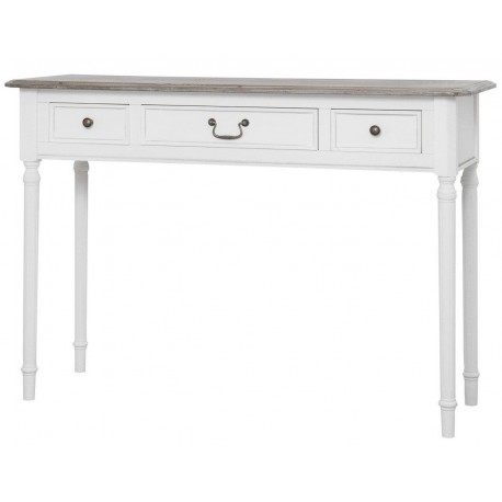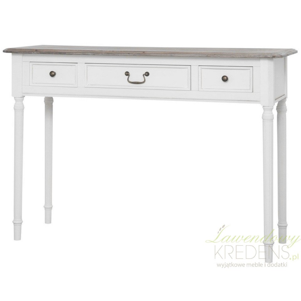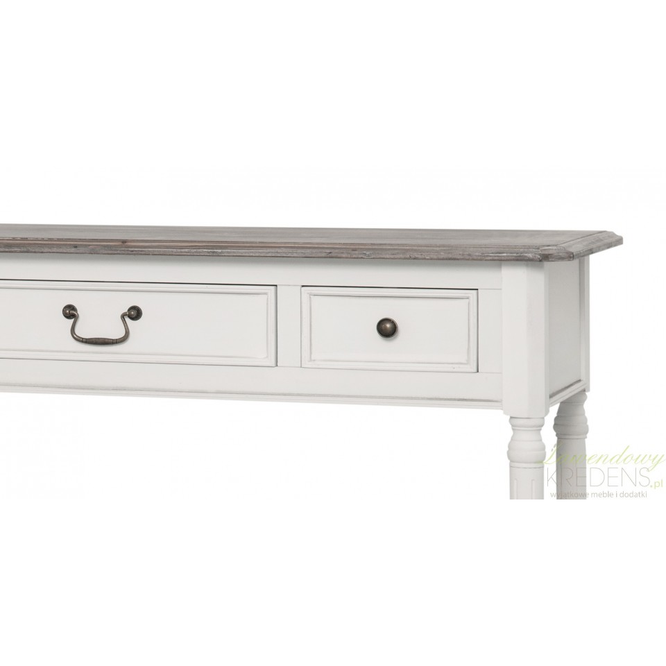 Drewniana konsola prowansalska na białej podstawie z wyróżniającym się, bielonym blatem w odcieniu naturalnego drewna. Cztery smukłe nogi zapewniają konsoli stabilność, dlatego te białe meble w stylu prowansalskim nadają się także na salonowy stolik czy wyższe biurko. Dopełnieniem funkcjonalności i wyglądu są trzy szuflady z metalowymi uchwytami!