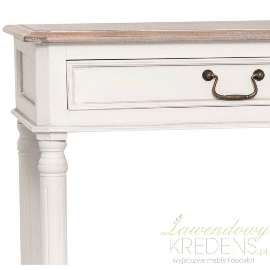 Niezwykła konsola prowansalska będąca wzorcowym przykładem na to, że meble prowansalskie nigdy nie zaskoczą Cię nudą i monotonnością. Biała powierzchnia konsoli została stylowo skontrastowana ze drewnianym blatem, na którego powierzchni widać wyraźnie bielenia, które eksponują wyraźnie zaznaczone podłużne słoje!