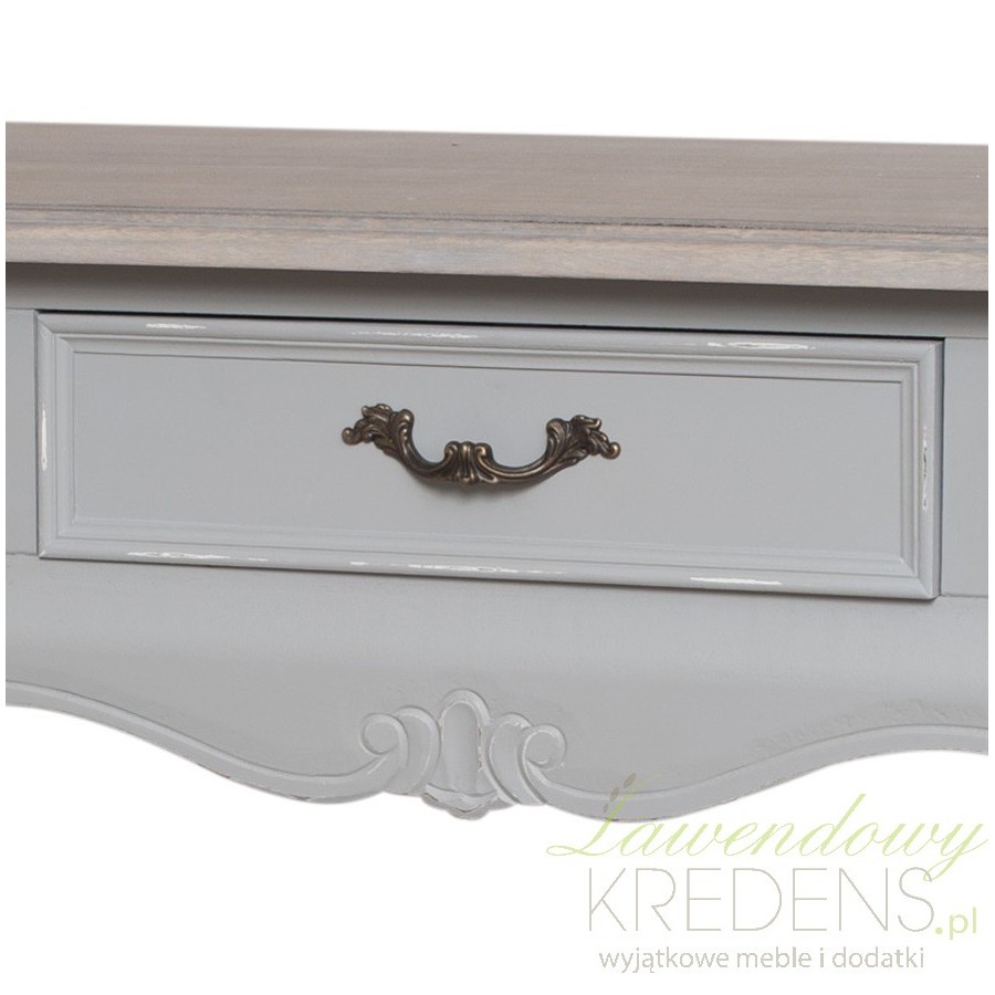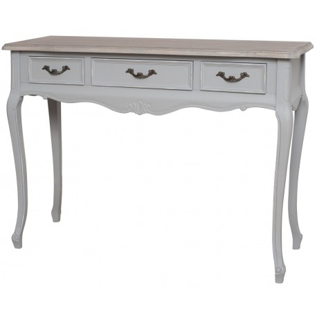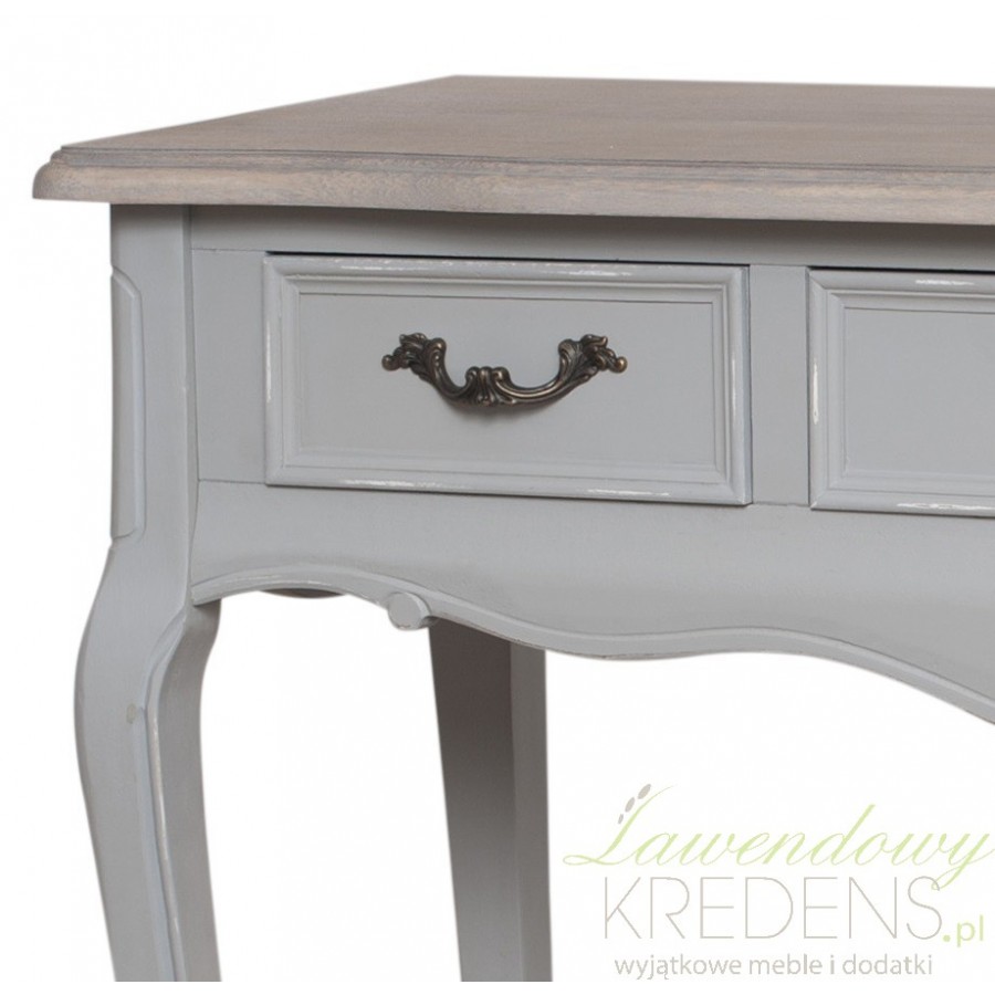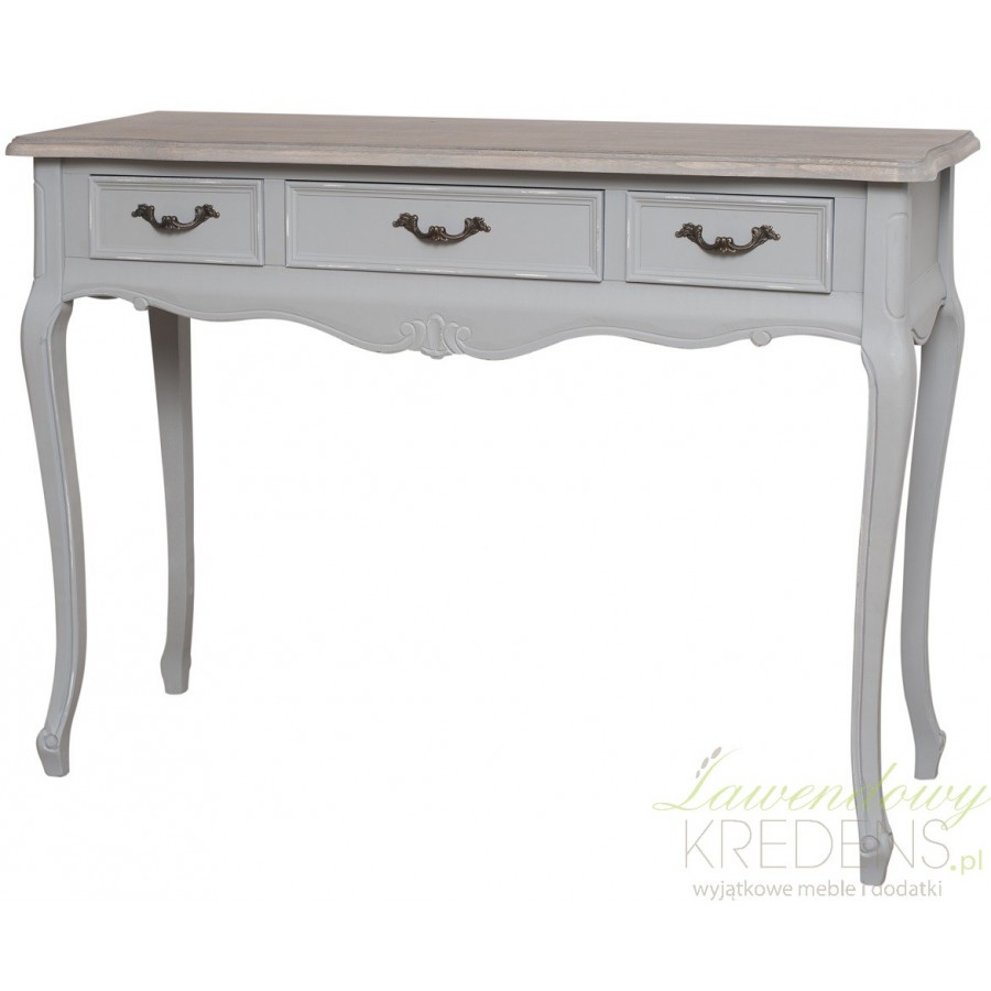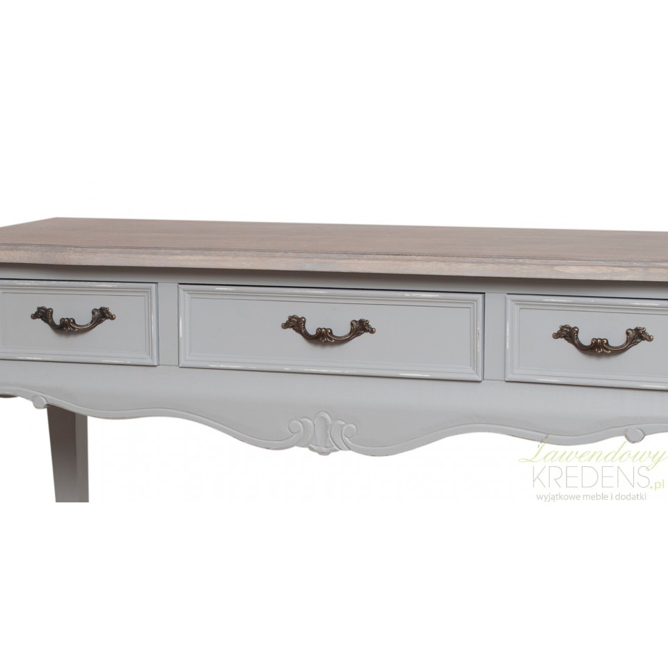 Topolowa konsola prowansalska w niezwykłym szarym kolorze podkreślonym delikatnie bielonym drewnianym blatem. Bardzo poręczna i łatwa w montażu toaletka w stylu prowansalskim może także służyć za wygodne biurko. Dodatkowo trzy szuflady zakończone metalowymi uchwytami dodają całości wdzięku i dodatkowej funkcjonalości!