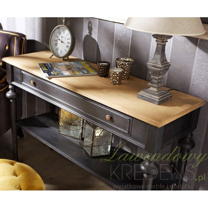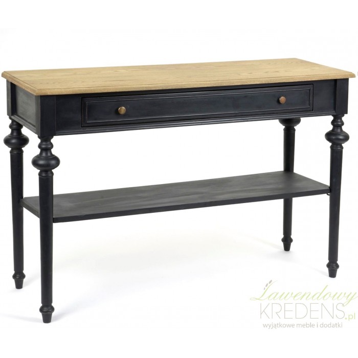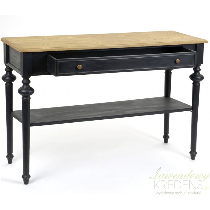 Wspaniała konsola prowansalska z kolekcji Livio to czarny, klimatyczny mebel wsparty na czterech solidnych nogach, dodatkowo podtrzymywanych przez znajdującą sie w środkowej części półkę. Wielkim wizualnym punktem charakterystycznym jest szeroki blat w odcieniu naturalnego drewna, pod którym znajduje sie długa szuflada!
