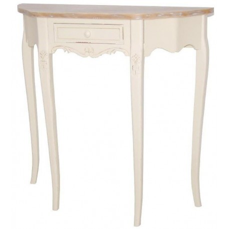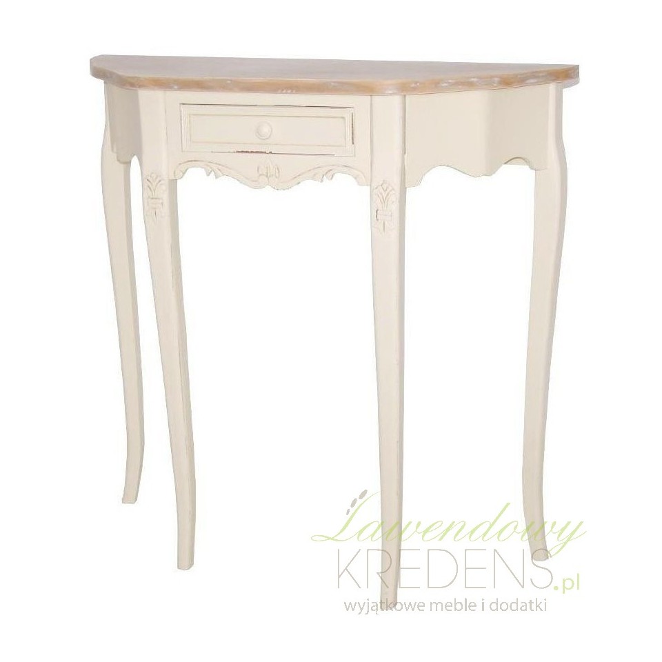 Bardzo kształtna konsola w stylu prowansalskim, reprezentująca meble postarzane, to prawdziwa perełka. Jej wyjątkowo dekoracyjny blat o postarzanej powierzchni doskonale uzupełnia kremową podstawę z niewielką szufladką w centralnej części.