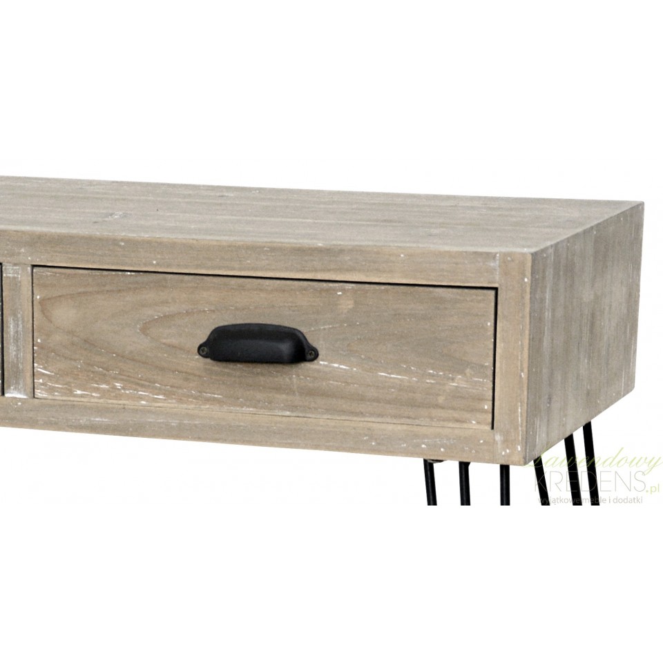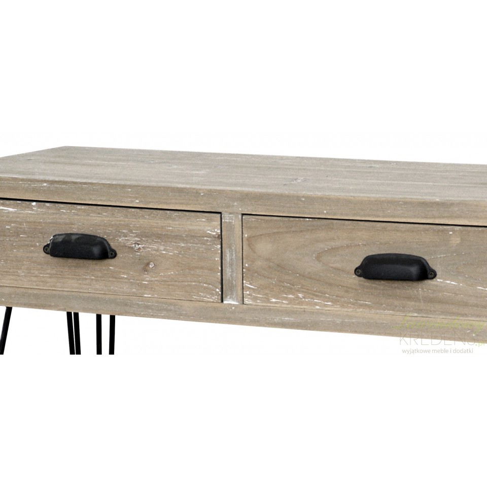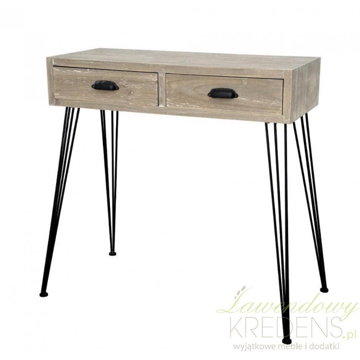 Konsola Loano w stylu prowansalskim z metalowymi nogami świetnie sprawdzi się jako biurko lub pomocniczy mebel w przedpokoju lub w salonie.