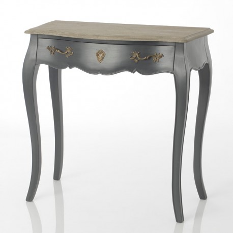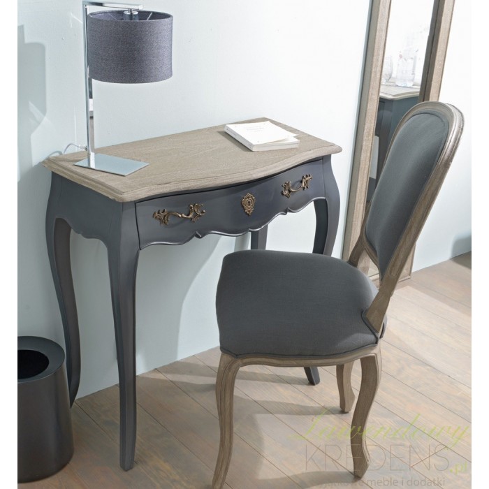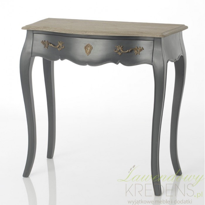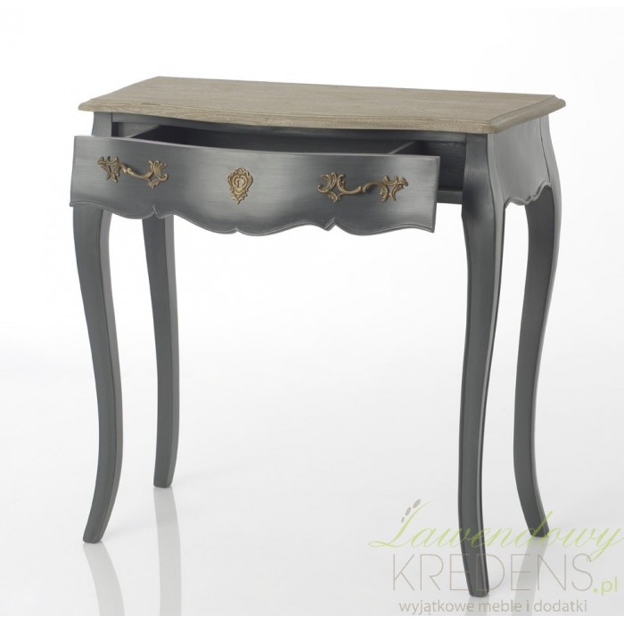 Konsola prowansalska dzięki ciemnej, grafitowej kolorystyce odmieni każde wnętrze dodając mu za jednym zamachem klasy i elegancji. Oryginalna konsola ma jasnobrązowy, wyprofilowany blat i subtelnie wygięte nogi. Doskonała do wykorzystania jako oryginalny model biurka. Czarna konsola ma jedną ale bardzo pojemną szufladkę z ozdobnymi gałkami w kolorze brązowozłotym. Meble w stylu prowansalskim od francuskiego producenta są solidne i piękne.