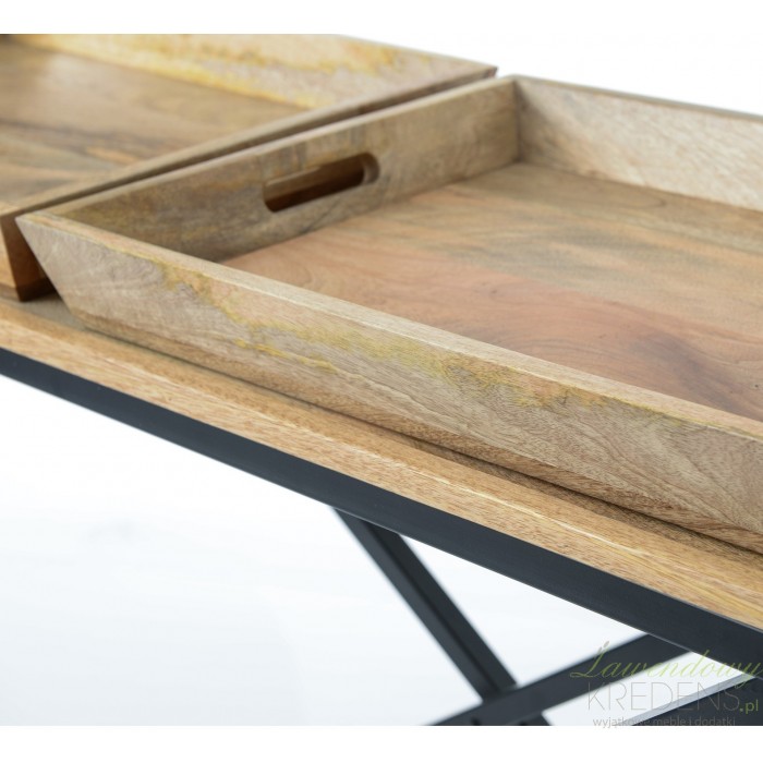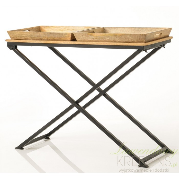 Wysoka na blisko 90 centymetrów konsola loftowa wykonana jest z solidnego drewna w kolorze naturalnego brązu i ustawiona na podwójnych, skrzyżowanych ze sobą prostych nogach. Na blacie znajdują się dwie poręczne tace z uchwytami po bokach. Konsola loftowa świetnie będzie prezentowała się w salonie jako miejsce na kwiatowe kompozycje lub inne dekoracje. Meble w stylu loftowym zapewnią Ci moc niezapomnianych wrażeń.