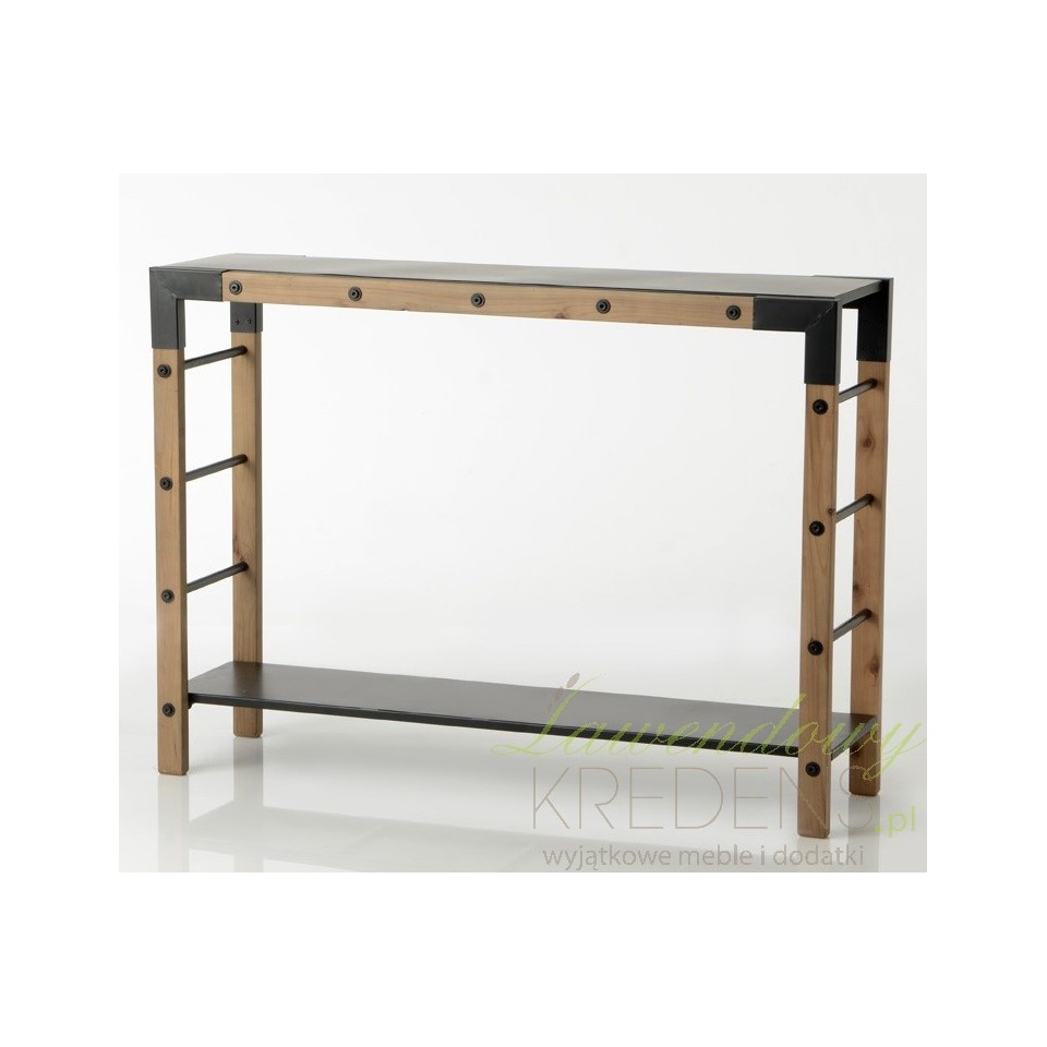 Nowoczesna konsola industrialna z metalowym blatem i metalową półką znajdującą się kilka centymetrów nad ziemią. Można ją wykorzystać zarówno w dużym salonie, jak i w niewielkiej kawalerce.