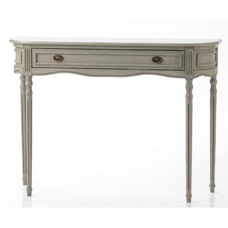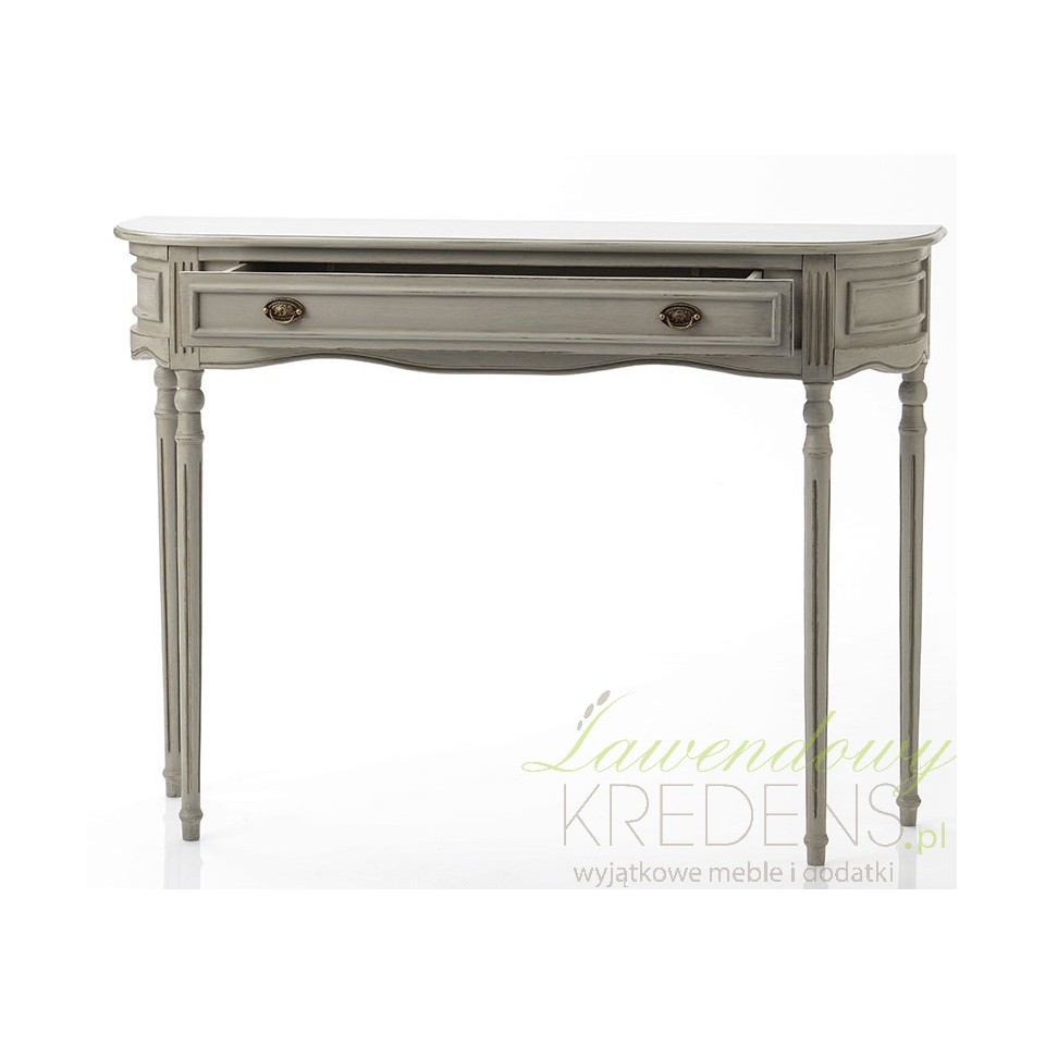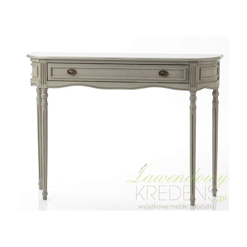 Szara konsola w stylu francuskim jest mniejszą wersją konsoli z kolekcji Luis. Dedykowana jest dla eleganckich aranżacji. Swym pełnym klasy wzornictwem również pasuje do wnętrz prowansalskich i tradycyjnych. Frezowania na bokach konsoli oraz na froncie szuflady perfekcyjnie komponują się z przednim panelem. Szare konsole w stylu francuskim to jedne z mebli, które wpasują się w styl każdej przestrzeni.