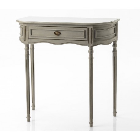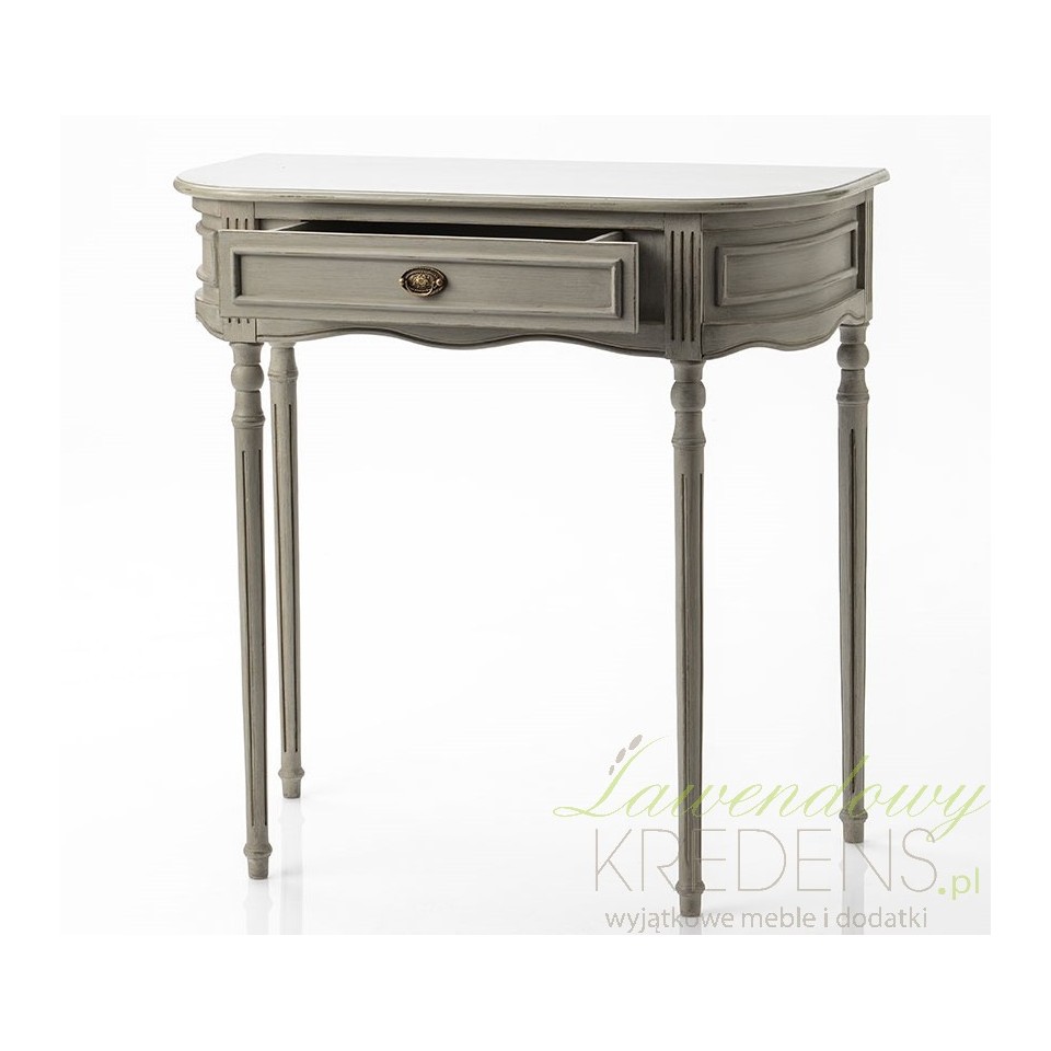 Beżowoszara konsola w stylu francuskim z szufladką ma opływową, zaokrągloną sylwetkę, która zapewnia jej wygląd pałacowego mebla, dzięki czemu doda klasycznego uroku Twojemu salonowi lub w przedpokoju. Ciekawy mebel z metalowym uchwytem z motywem roślinnym pomaga uporządkować bibeloty w salonie, chroniąc je przed kurzem. Francuska konsola opiera się na prostych nogach z pięknym, postarzanym wykończeniem. Meble w stylu francuskim są stabilne, wytrzymałe i wymagają niewielkiej konserwacji przez długie lata użytkowania.
