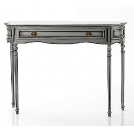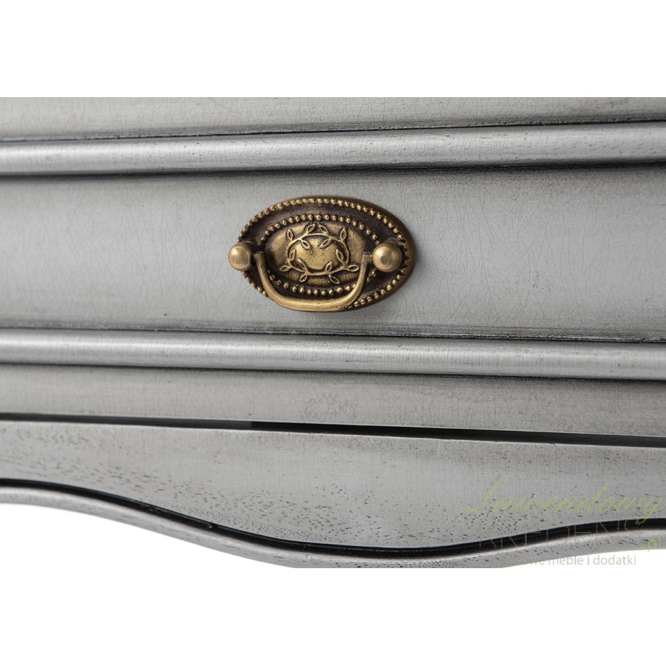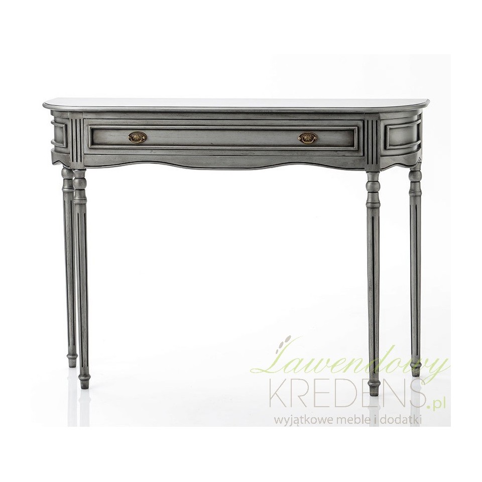 Konsola francuska za sprawą ciemnej, szarej kolorystyki wprowadzi do wnętrza spokój, elegancję i harmonię. Konsola w stylu francuskim posiada ciemnoszary, obszerny blat, proste nogi i delikatnie zaokrąglone boki. Genialna również wtedy gdy potrzebujesz oryginalnego biurka lub stylowej toaletki. Ciemnoszara konsola wyposażona jest w jedną ale bardzo pojemną szufladę z metalowymi i rzeźbionymi uchwytami. Meble w stylu francuskim od światowego producenta są funkcjonalne i piękne.