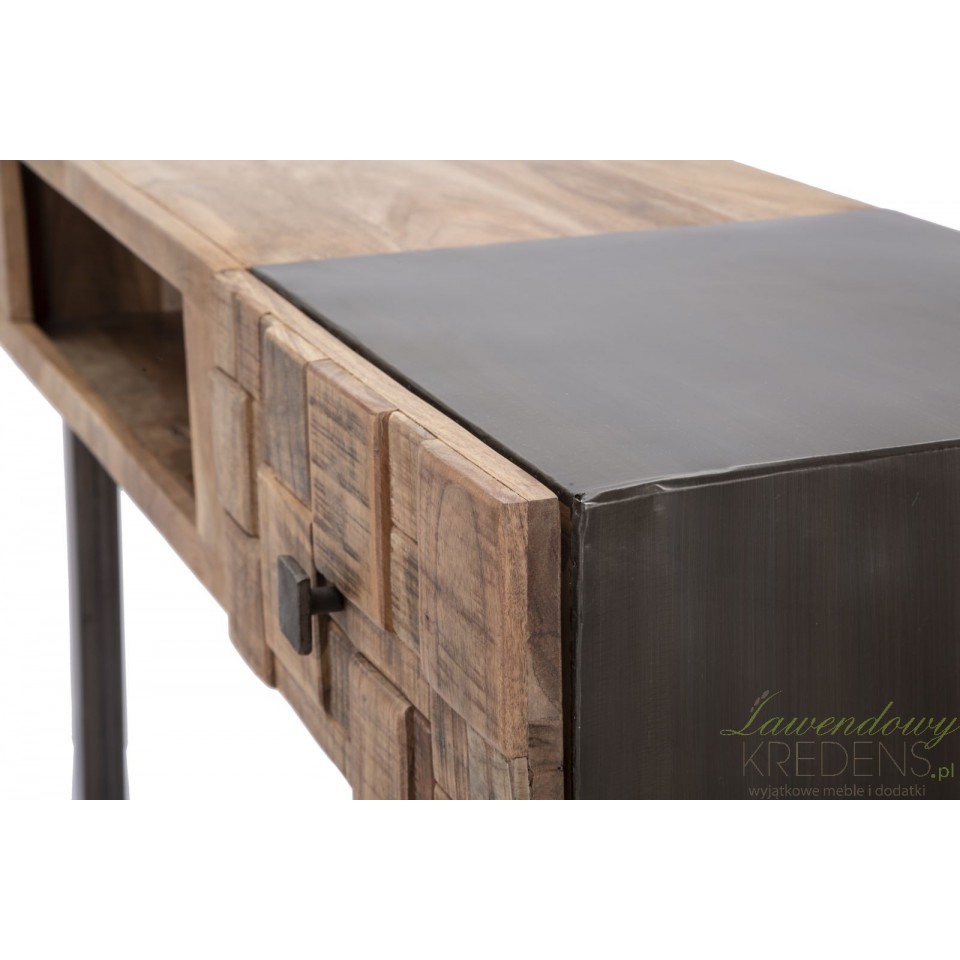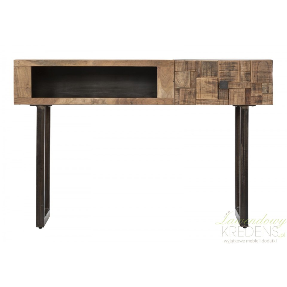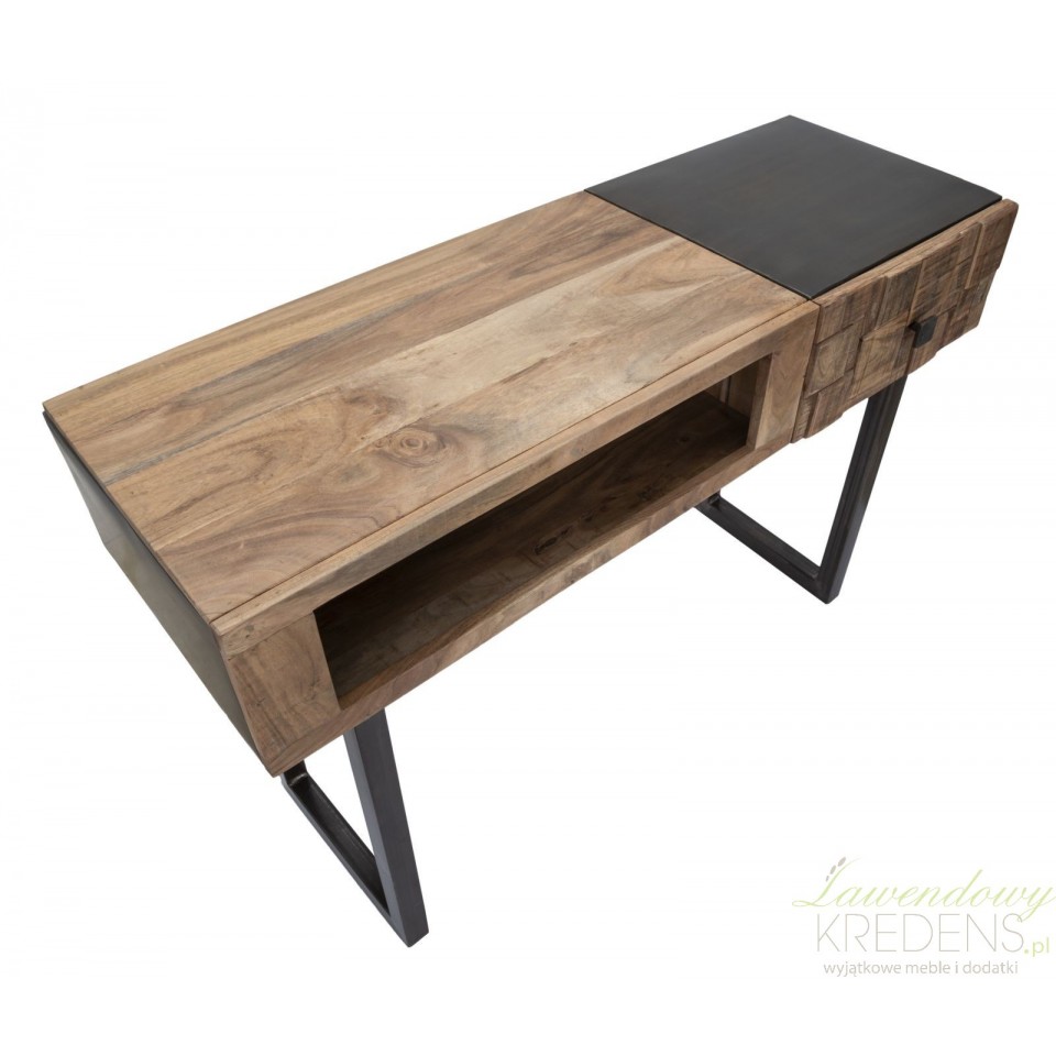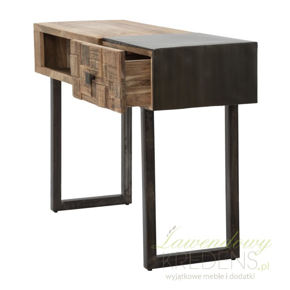 Stylowa konsola loft z ciekawą fakturą na blacie i na frontach sprawdzi się w nowoczesnych wnętrzach i nie tylko. Po bokach mebla znajdują się solidne, metalowe nogi w ciemnym kolorze. Górną część mebla stanowi szufladka i otwarta półka. Całość wyróżnia niebanalny design, który z pewnością podkreśli industrialny charakter wnętrza. Zastosowanie metalu, drewna i minimalistycznej formy sprawia, że konsola loftowa zachwyca niepowtarzalnym wyglądem.