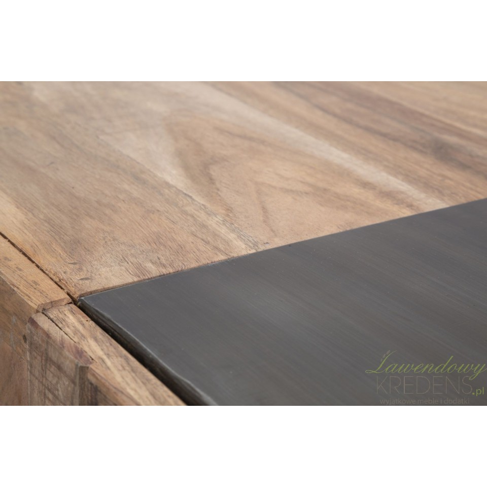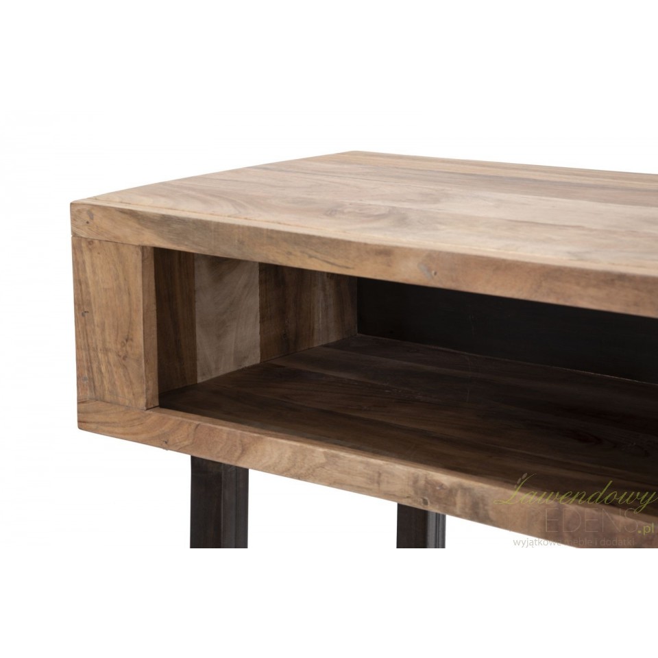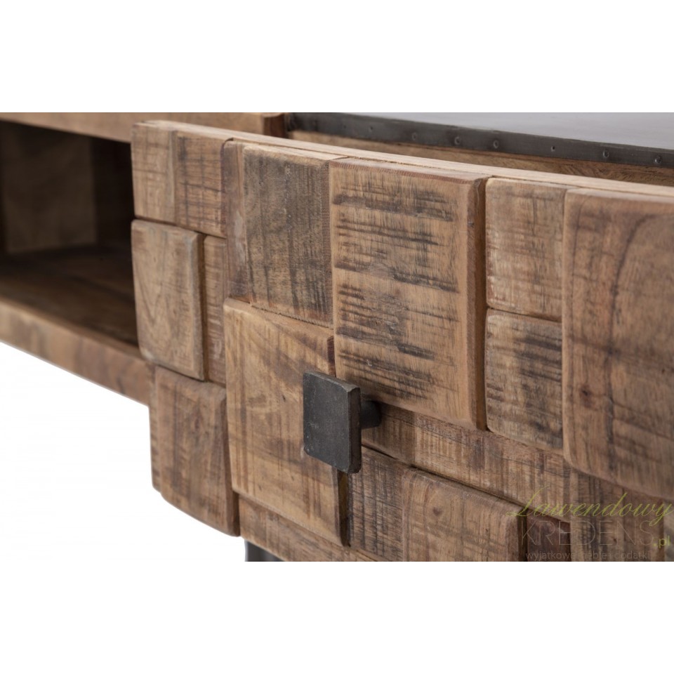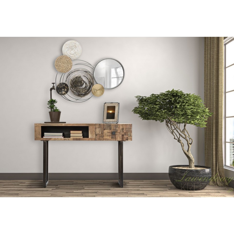Stylowa konsola loft z ciekawą fakturą na blacie i na frontach sprawdzi się w nowoczesnych wnętrzach i nie tylko. Po bokach mebla znajdują się solidne, metalowe nogi w ciemnym kolorze. Górną część mebla stanowi szufladka i otwarta półka. Całość wyróżnia niebanalny design, który z pewnością podkreśli industrialny charakter wnętrza. Zastosowanie metalu, drewna i minimalistycznej formy sprawia, że konsola loftowa zachwyca niepowtarzalnym wyglądem.
