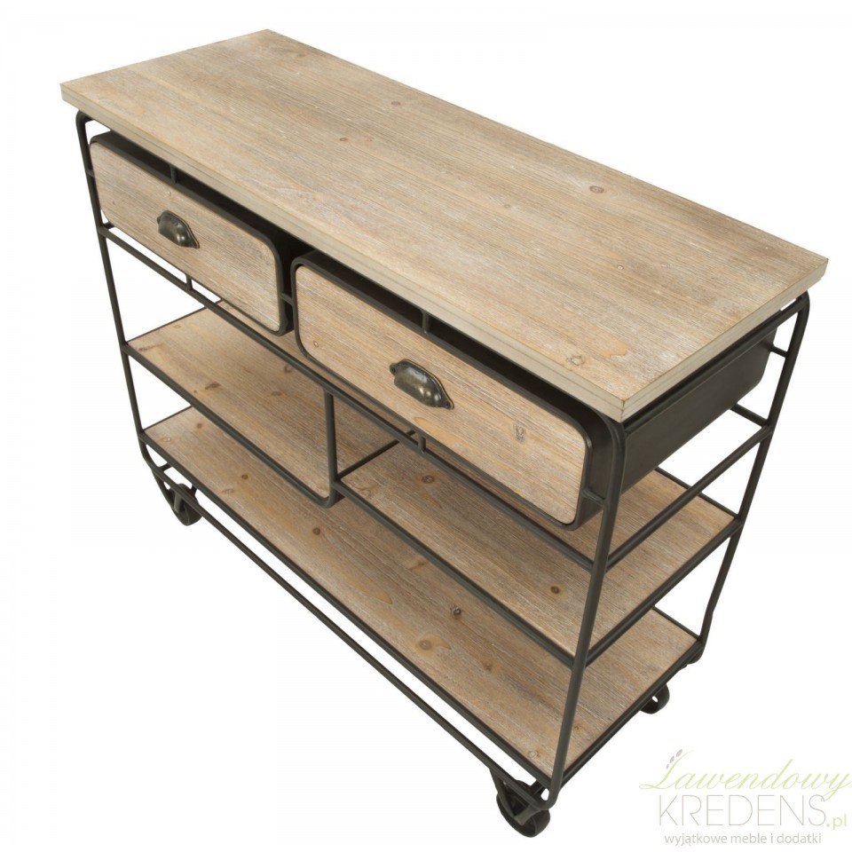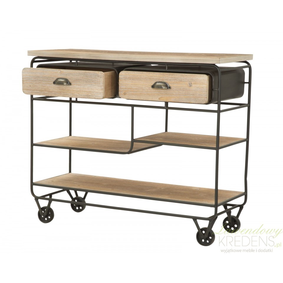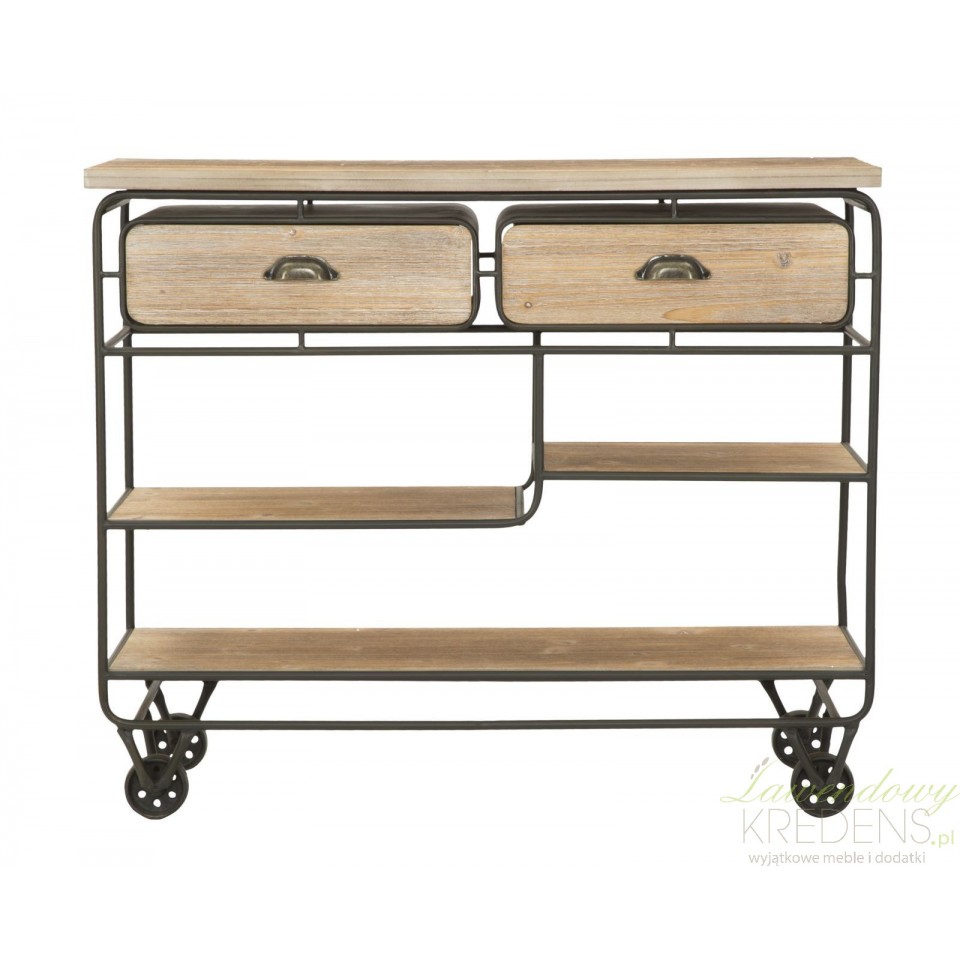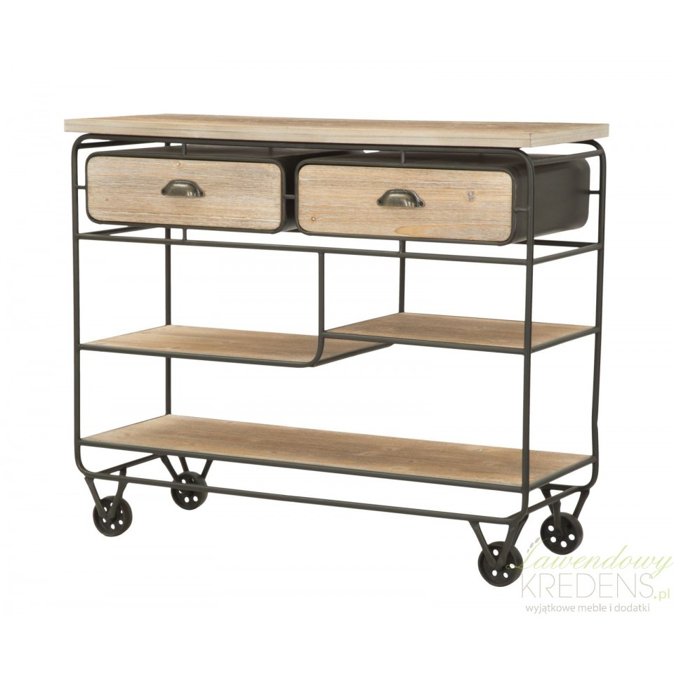 Konsola loftowa industry to mebel o wyjątkowej formie, posiadający cztery kółka metalowe, trzy półki różniące się szerokością oraz dwie szuflady. Użyteczność to charakterystyczna cecha tego pomocniczego mebla, co zachęca do wykorzystania go w kuchniach, jadalniach, a nawet w lokalach usługowych takich jak bary i restauracje. Niezależnie od tego gdzie zostanie wykorzystana konsola loftowa możesz liczyć na to, że spełni swoją funkcję oferując Ci mnóstwo funkcjonalności i ponadczasowy design.
