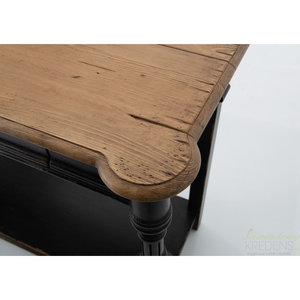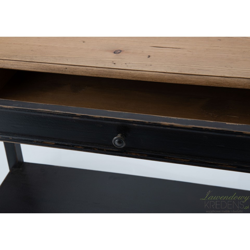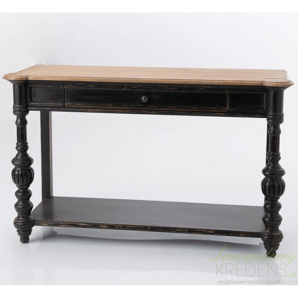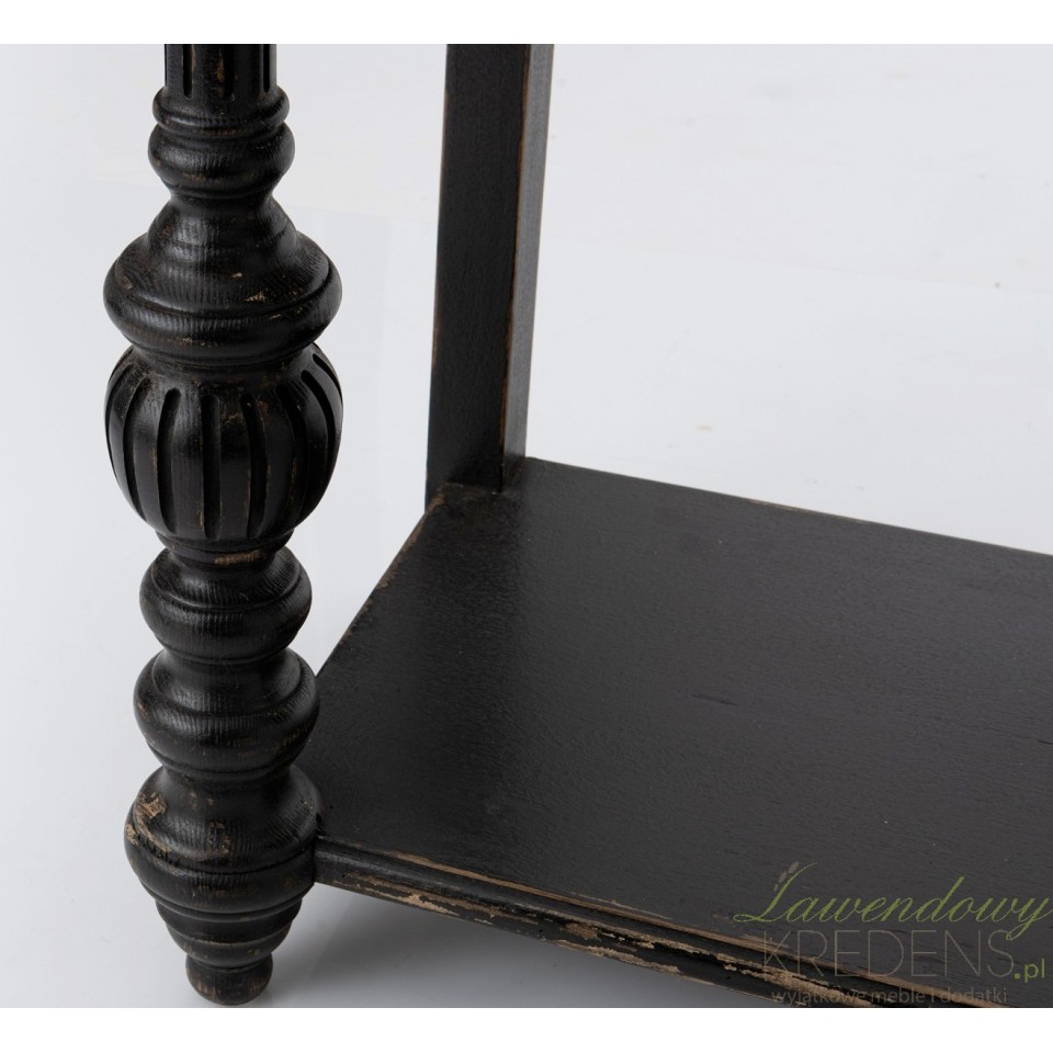 Czarna konsola w stylu prowansalskim to projekt inspirowany wyglądem francuskich kamienic z epoki romantyzmu. Ta wąska konsola prowansalska służy jako stylowa scena do eksponowania dekoracji w przedpokoju lub w salonie, nie zajmując zbyt wiele powierzchni podłogi. Posiada prostokątny, brązowy blat, a jej piękne, kuliste nogi oraz cała dolna część mebla wraz z szufladą i półką są celowo postarzone. Postarzane meble cechują się doskonałą stabilnością i efektowną stylistyką.