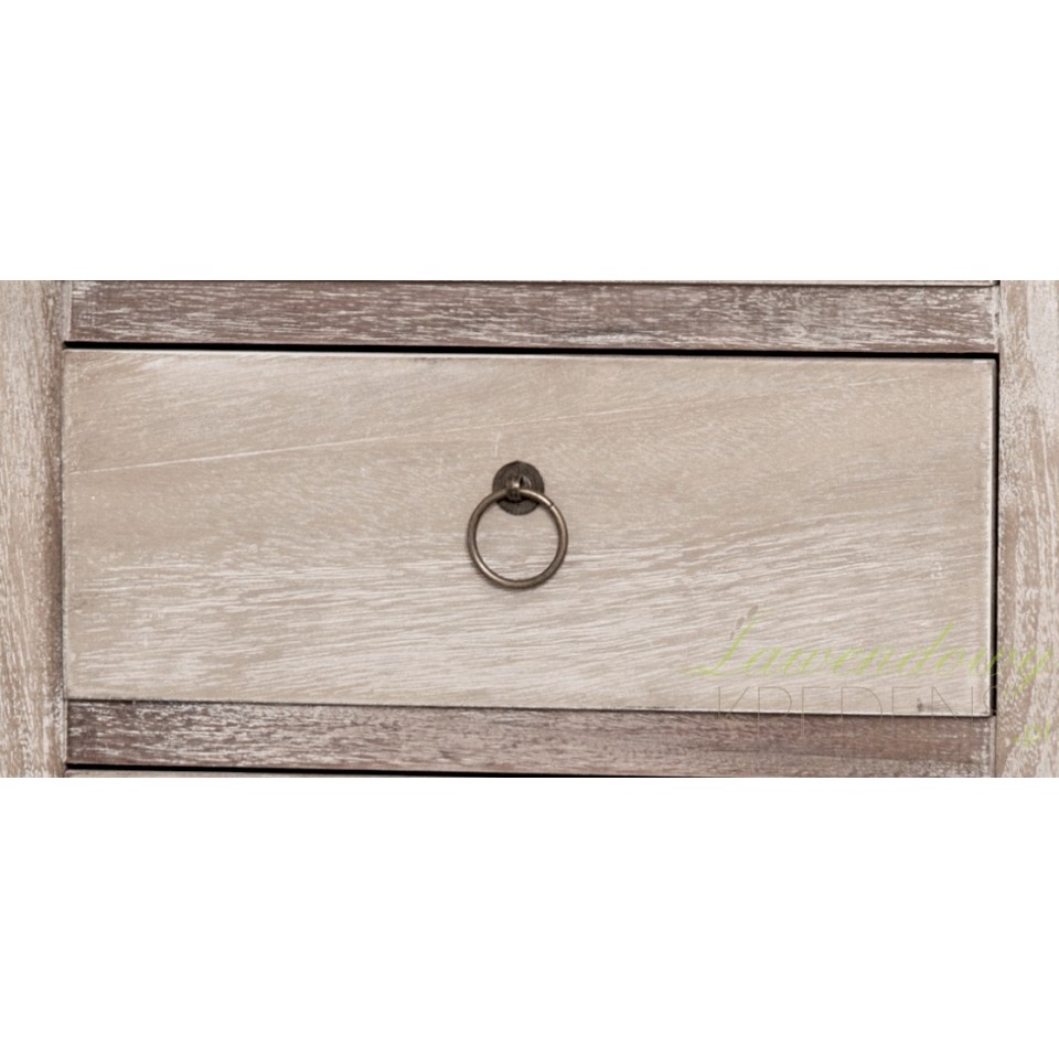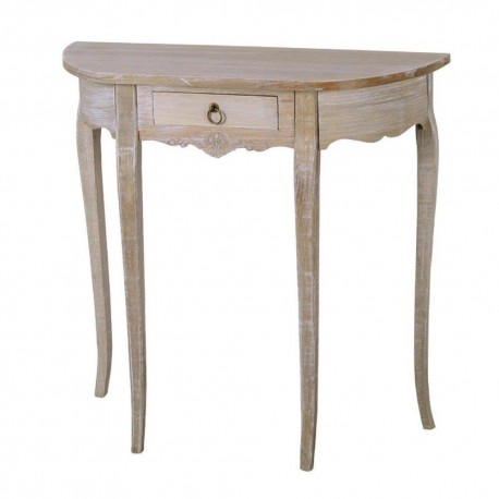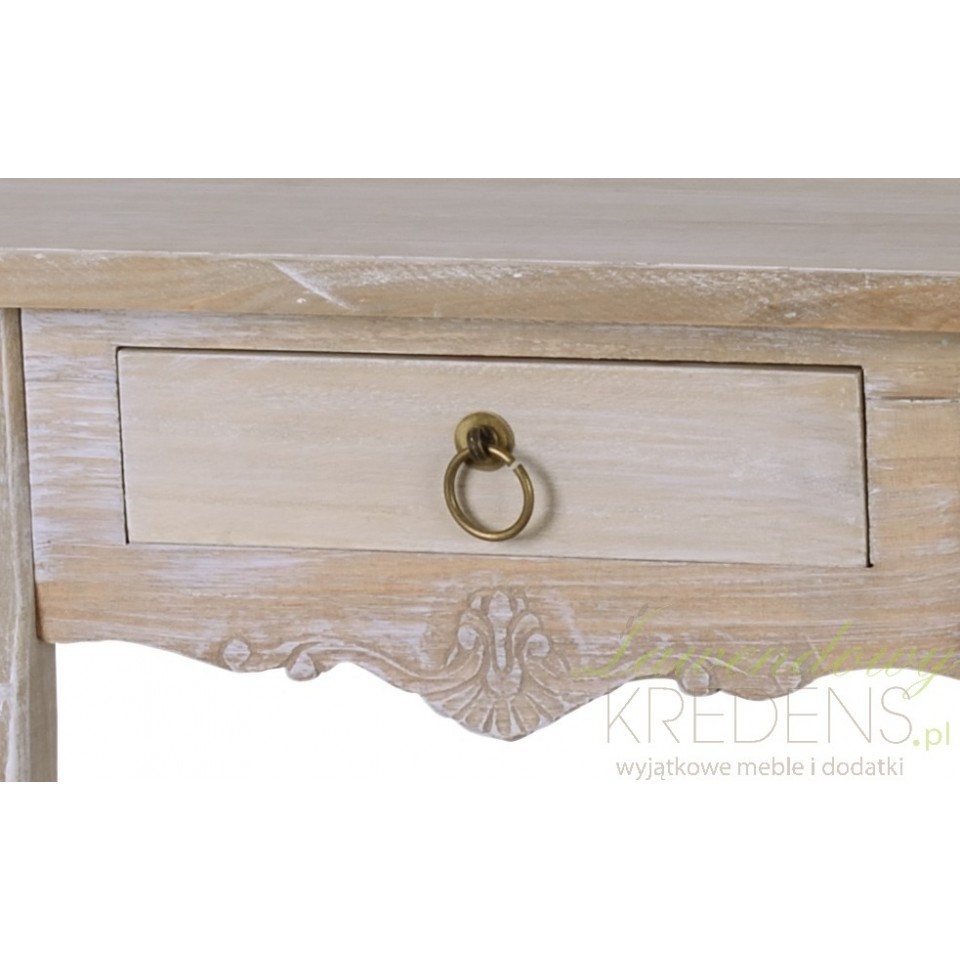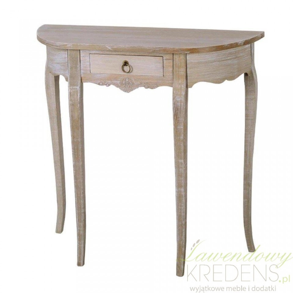 Owalna konsola drewniana w stylu prowansalskim, posiadająca jedną, niedużą szufladkę otwieraną metalowym uchwytem. Konsola ma cztery szczupłe nóżki o delikatnie zaokrąglonym kształcie, który dodaje meblowi lekkości. Do konsoli polecamy inne meble prowansalskie o bielonej powierzchni, pochodzące z tej samej kolekcji.