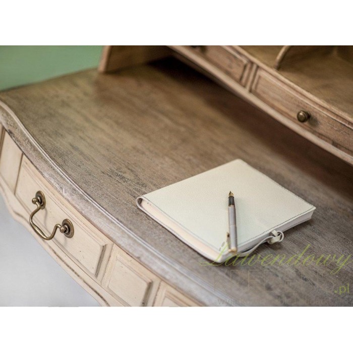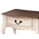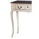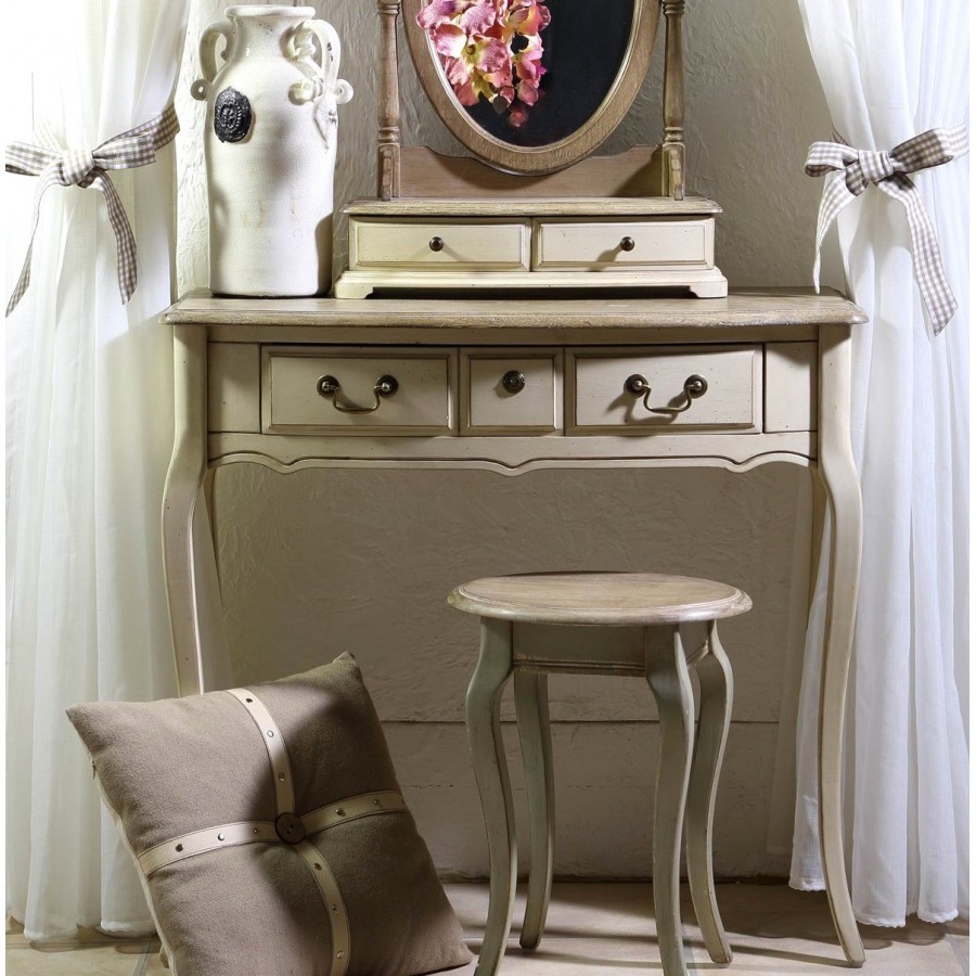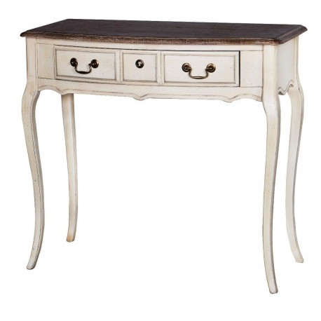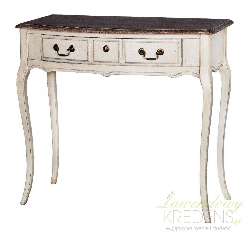 Charakterystyczne dla mebli w stylu prowansalskim uformowanie nóg, trzy symetrycznie umieszczone szuflady (dwie większe i jedna mniejsza pośrodku) oraz metalowe uchwyty. Drewno kauczukowe pomalowane ręcznie na beż, które jest odporne na zadrapania, uderzenia i spękania sprawia, że konsola w stylu prowansalskim świetnie pełnić może role toaletki w sypialni czy stolika pod lustro. Sprawdzi się także jako niewielkie stylowe biurko.