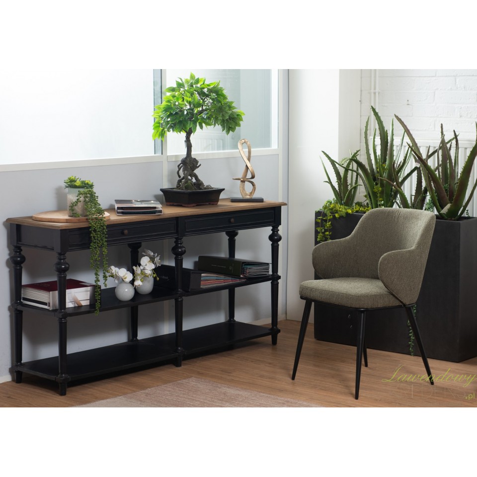 Konsola prowansalska, długa, z dwoma półkami i dwoma szufladami, które użytecznie przysłużą Ci się swoją powierzchnią. Ciemny kolor drewnianej konsoli został cudownie wyeksponowany poprzez jasny blat, który podkreśla niepowtarzalność mebla.