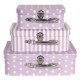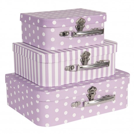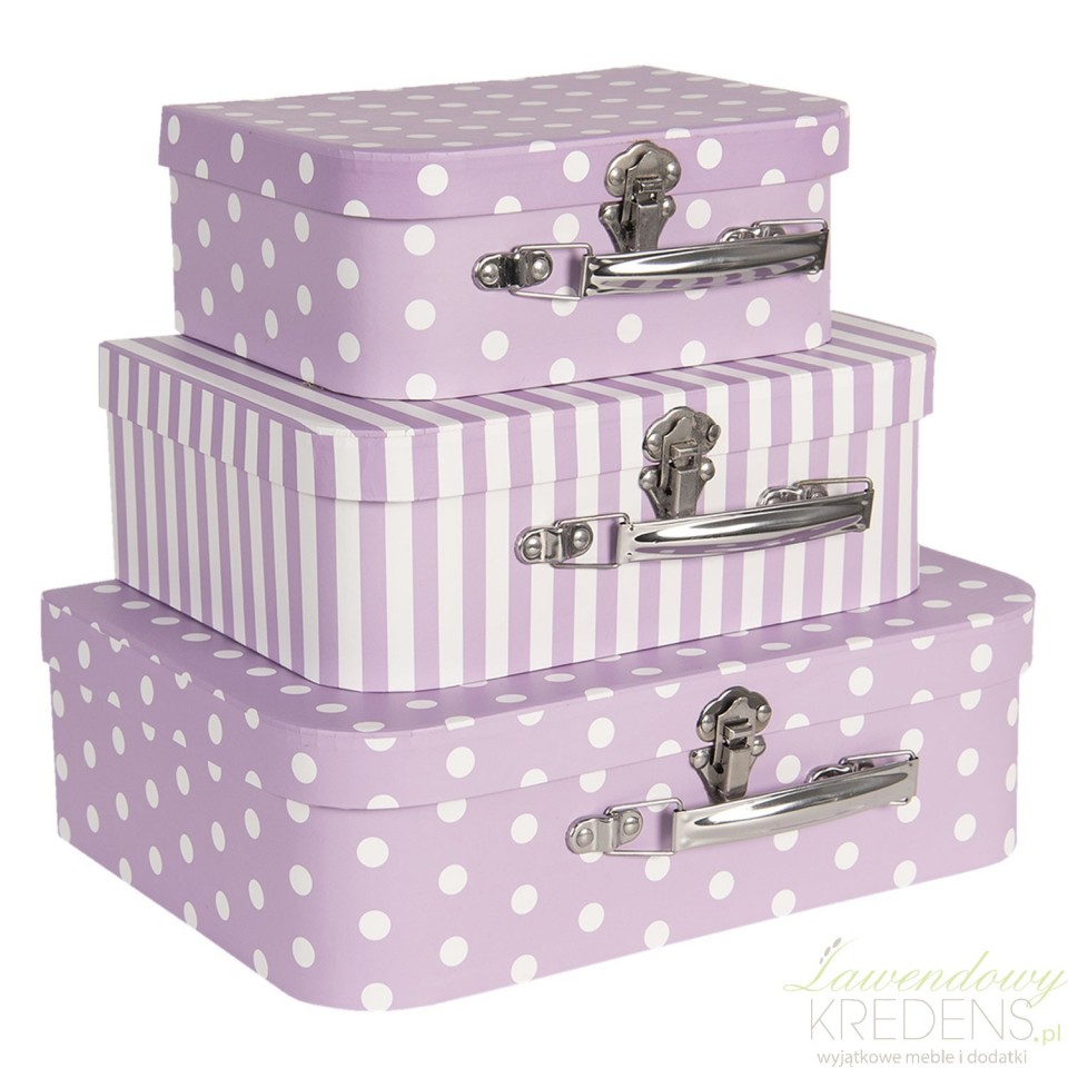 Fioletowe pudła ozdobne w białe paski i kropki to rzy pojemniki w kształcie walizek, wyposażone w metalowe klamry. Pudła zrobiono z twardej i wytrzymałej tektury.