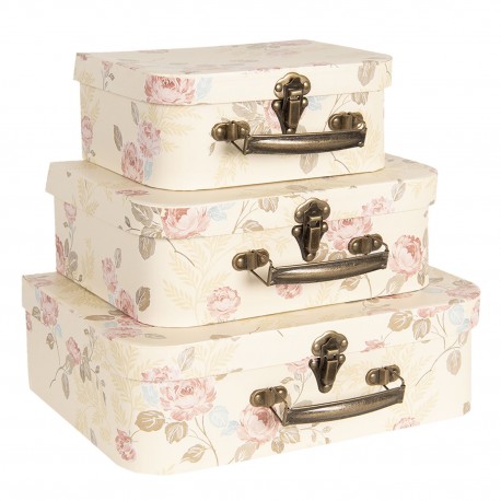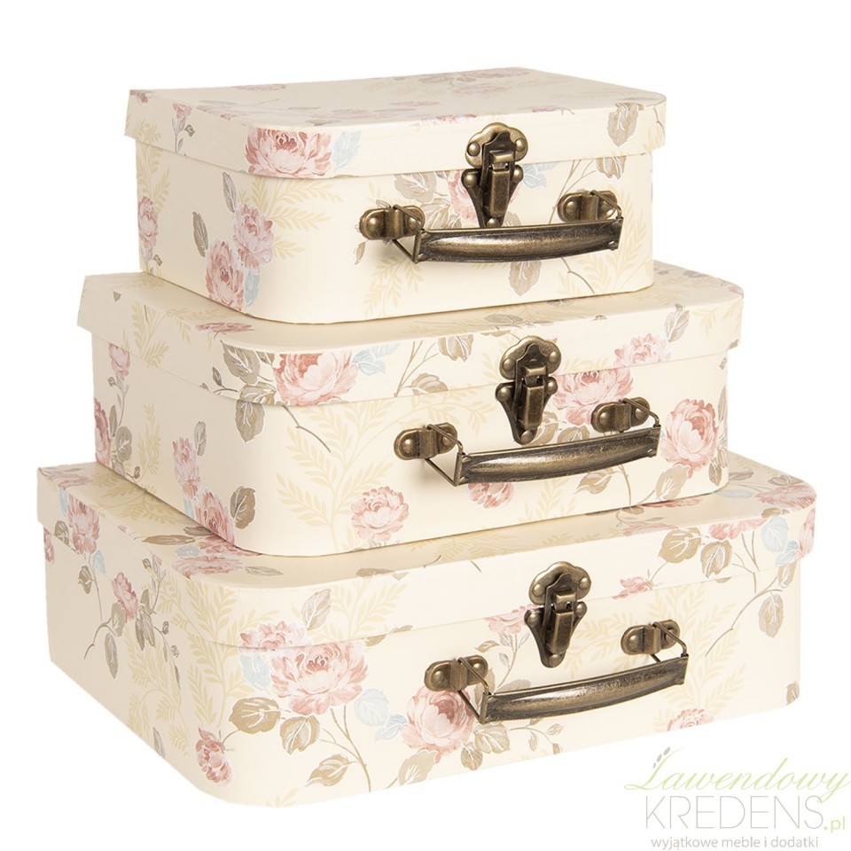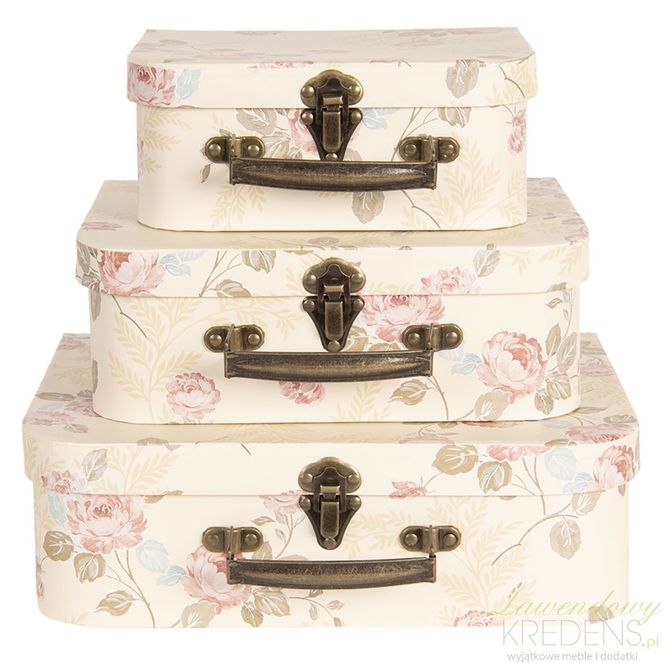 Pudła ozdobne do przechowywania wykonane z metalu i kartonu z dekoracyjnym motywem kwiatów przydadzą się w każdym pomieszczeniu. Kartonowe pudła w kształcie walizki od marki Clayre&Eef są trwałe i wykonane z dbałością o każdy szczegół. W zakresie wzornistwa design pojemników nawiązuje do modnego obecnie stylu prowansalskiego. Subtelna kolorystyka doskonale sprawdzi się w wielu aranżacjach.