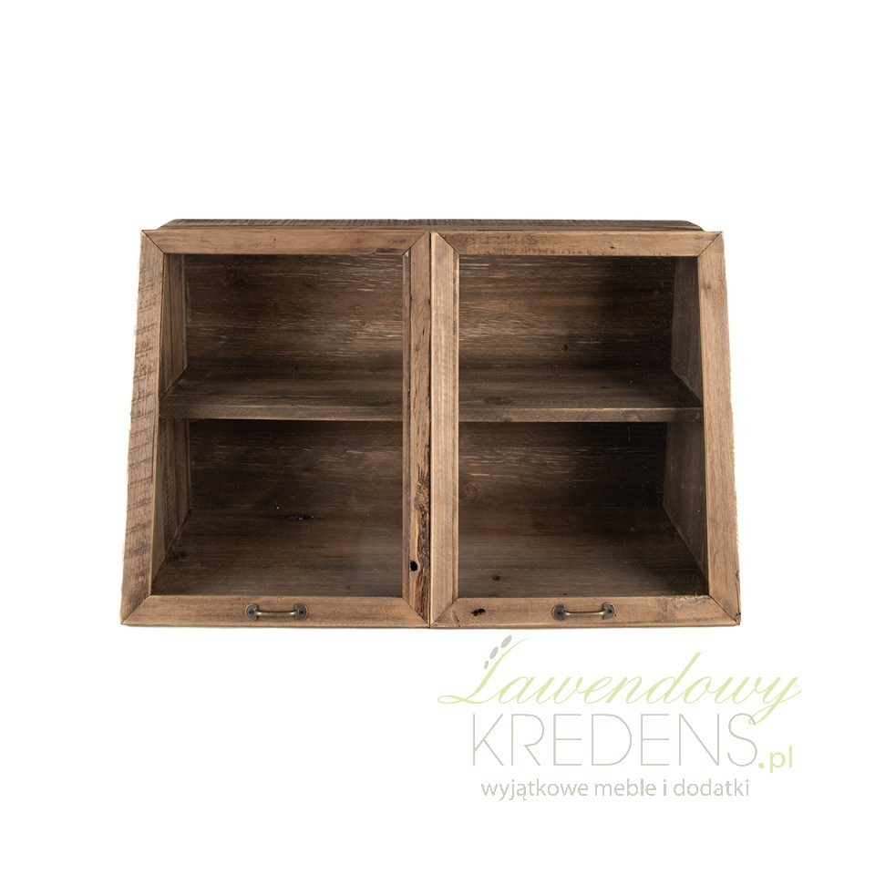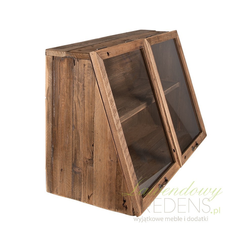 Drewniana szafeczka Clayre & Eef z lekko pochylonymi frontami ze szkła posiada dwa uchwyty wykonane w całości z metalu.