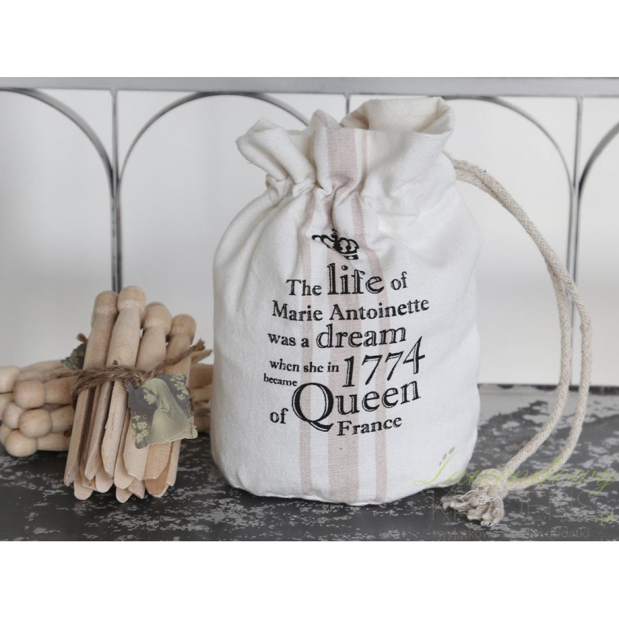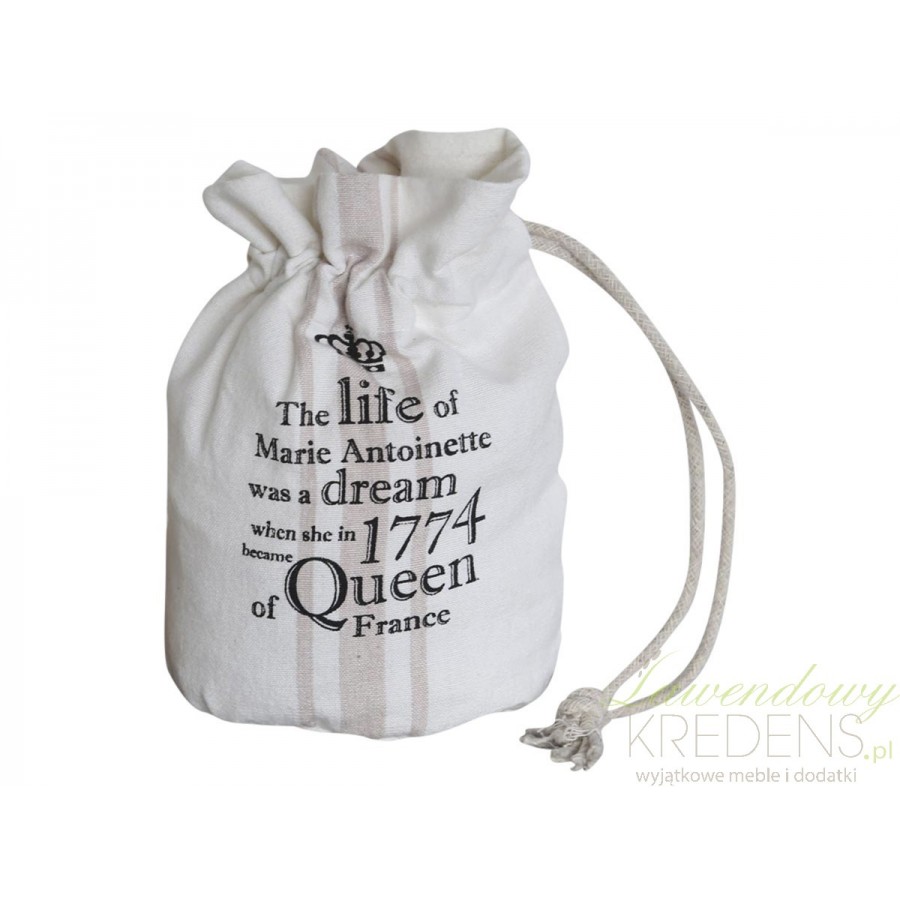 Dodatki w stylu francuskim pokazują, jak z czegoś przeciętnego stworzyć coś wartościowego i niepowtarzalnego. Materiałowy woreczek firmy Chic Antique ma kolor biały a na jego tle znajdują się czarne, angielskie napisy i rysunek korony. Nawiązuje on do koronacji królowej Francji Marii Antoniny. Woreczek z kolekcji Marie Antoinette ściągany jest na górze sznurkiem.