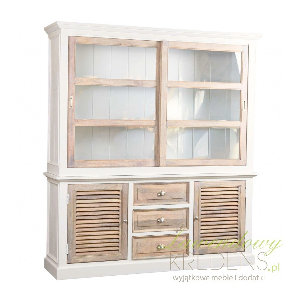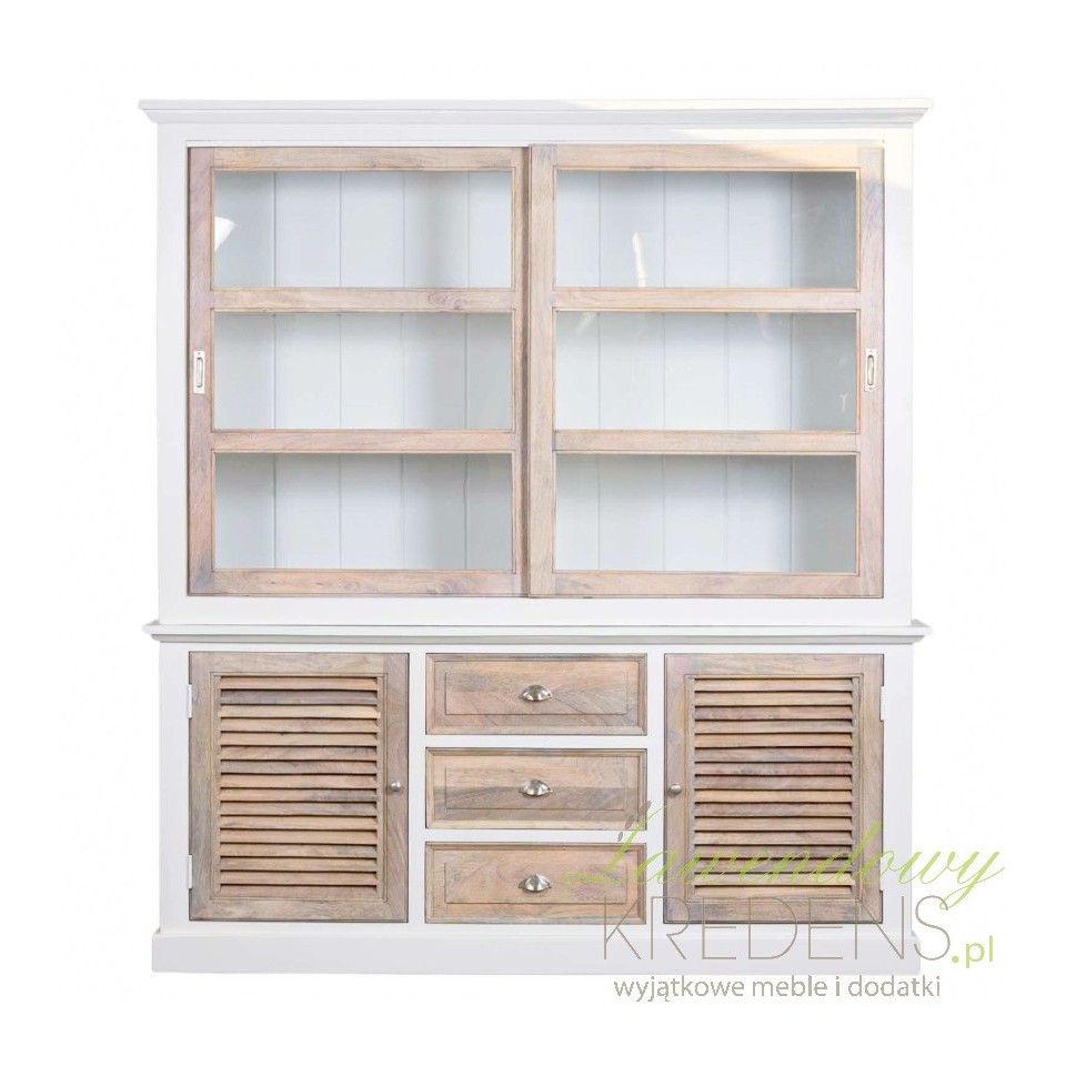 Bristol White łączy malowaną na biało bryłę z naturalnym, przecieranym drewnem na frontach, dzięki czemu pasuje do wnętrz coastal, rustykalnych i klasycznych. Zwróć uwagę na subtelną patynę i widoczną teksturę – to właśnie te detale budują wrażenie mebla „z historią”, a nie fabrycznie gładkiej płyty. W praktyce łatwo zestawisz go z dębowym stołem, lnianymi tekstyliami, ceramiką w odcieniach ecru i czerni (dla przełamania).Przesuwne, przeszklone drzwi i pełna organizacja: szuflady oraz lamelowe szafki
