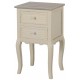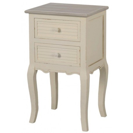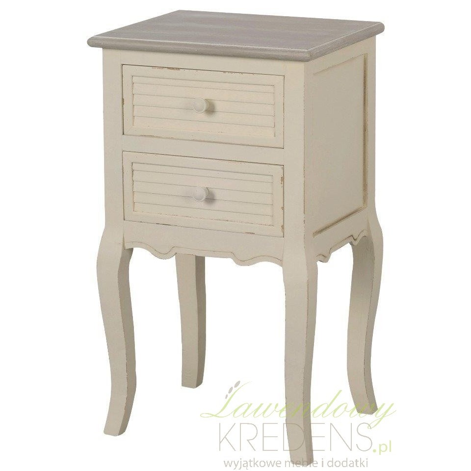 Stolik nocny w stylu prowansalskim, który posiada dwie szufladki oraz nóżki o eleganckim, delikatnie zaokrąglonym kształcie. Powierzchnia podstawy mebla ma kremowy kolor z uroczymi przetarciami farby w stylu shabby chic, a blat stolika jest bielony. Stolik ma bardzo piękny kształt i będzie uroczym dodatkiem do każdej sypialni.