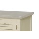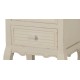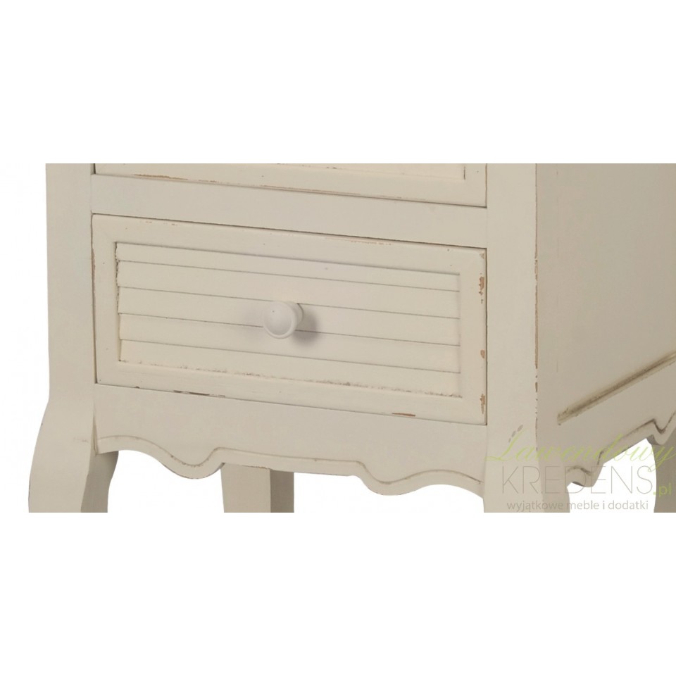 Prowansalski stolik nocny o kremowej, przecieranej powierzchni i bielonym blacie.