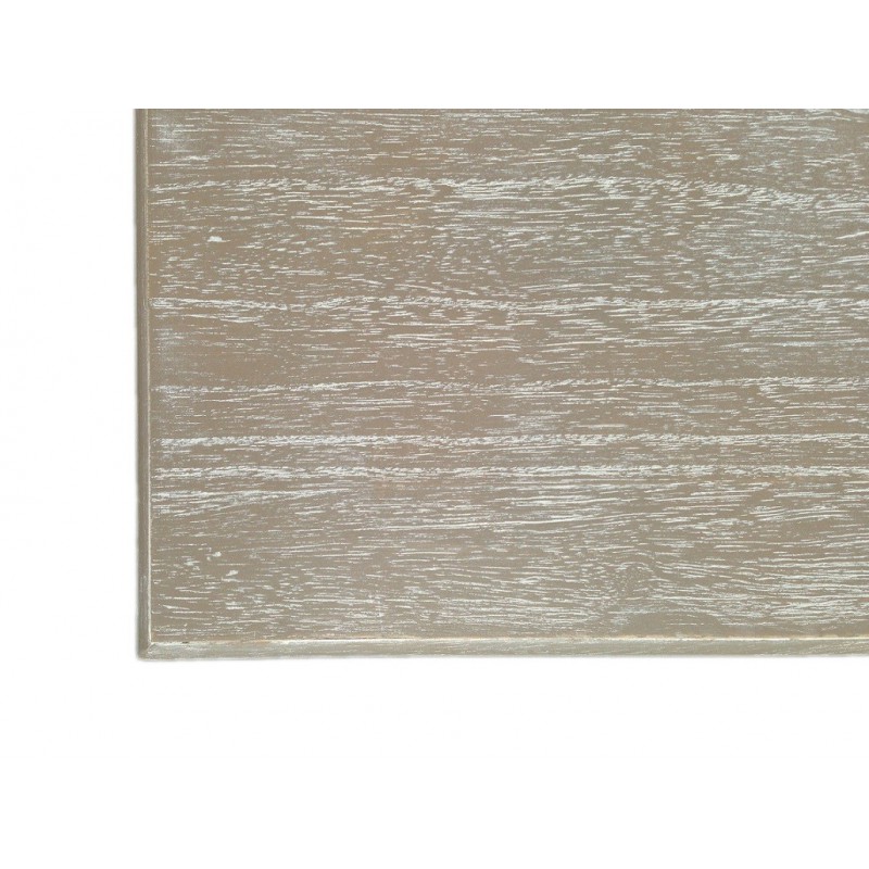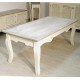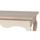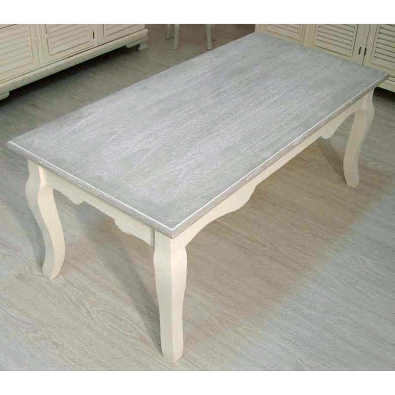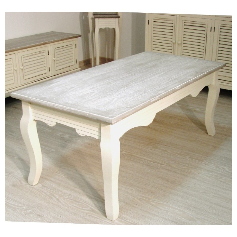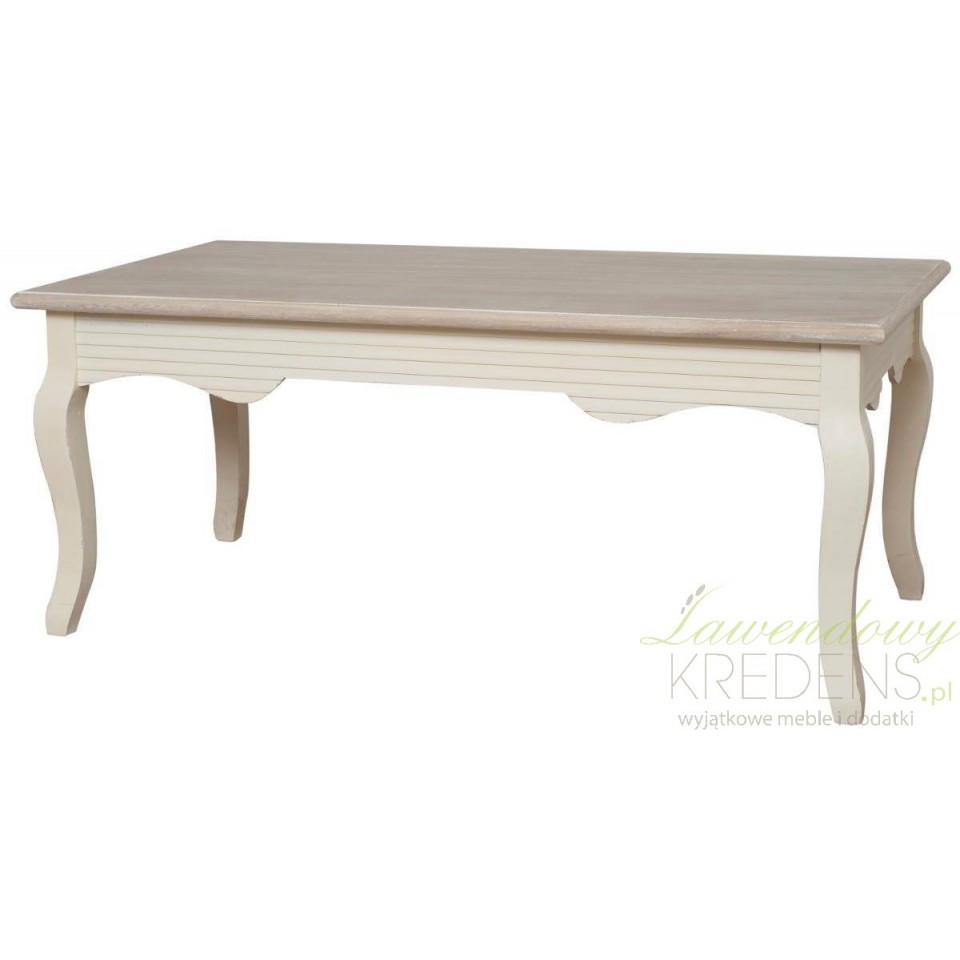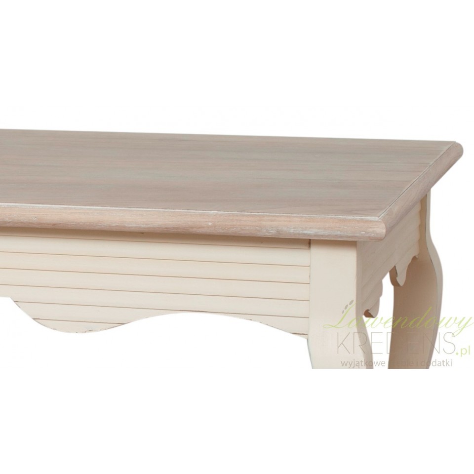 Niski stolik prowansalski z bielonym blatem idealny do salonu. Podstawa stolika ma kremowy, matowy kolor z widocznymi gdzieniegdzie przetarciami farby, dodającymi stolikowi uroku.