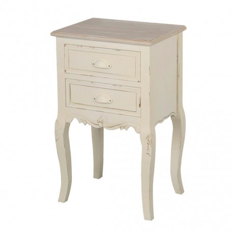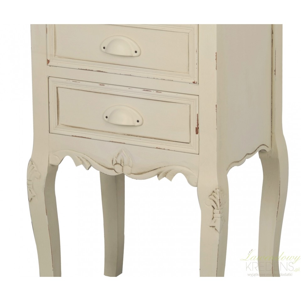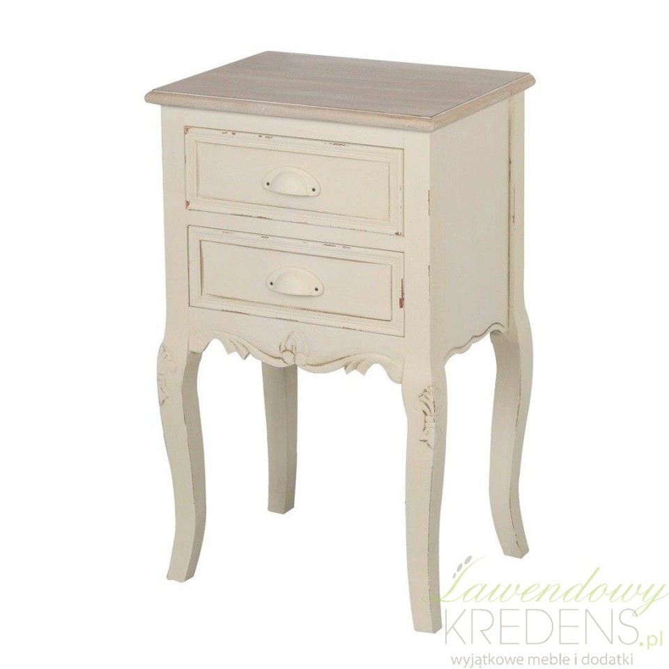 Postarzany stolik nocny we francuskim stylu o kremowym kolorze ze stylizowanymi przetarciami farby i o bielonym blacie. Stolik posiada dwie szufladki tuż pod blatem a w jego dolnej częśći znajdują się eleganckie, dekoracyjne rzeźbienia. Stolik można postawić obok łóżka w sypialni lub też obok sofy w salonie, gdzie idealnie sprawdzi się jako stolik na lampkę lub pomocnik do odstawienia kubka czy filiżanki.