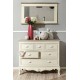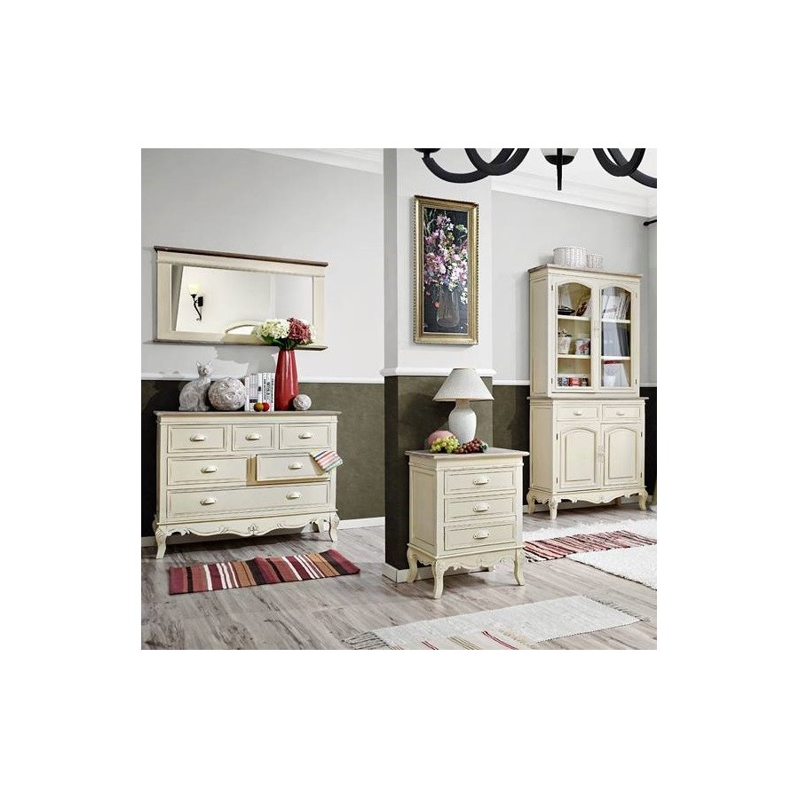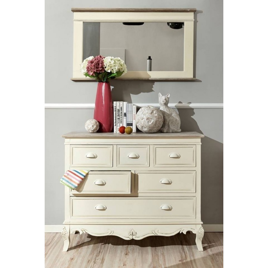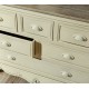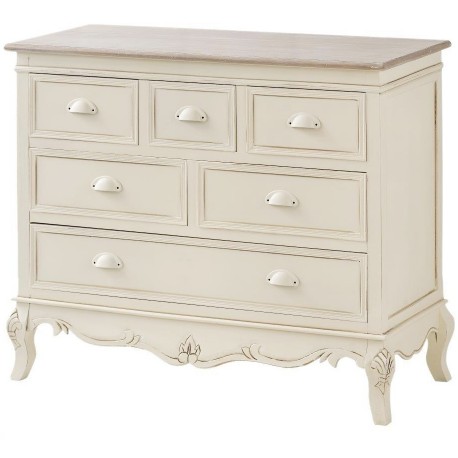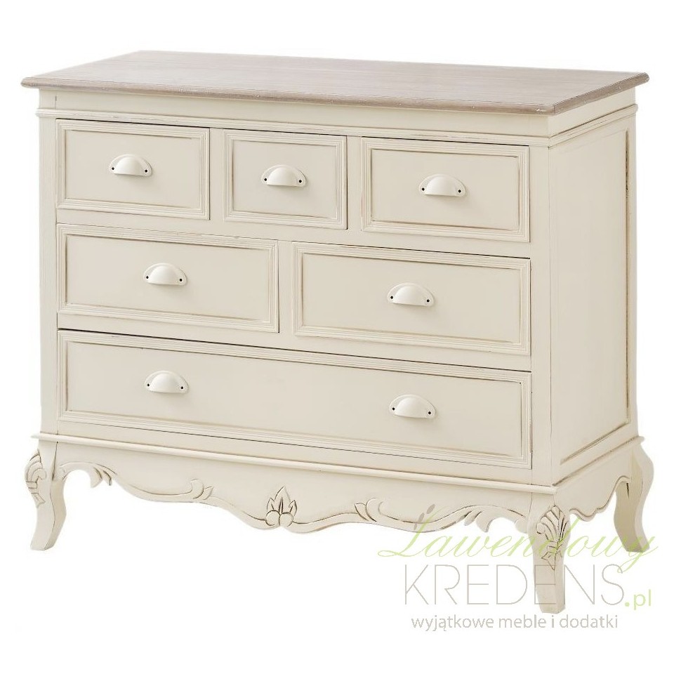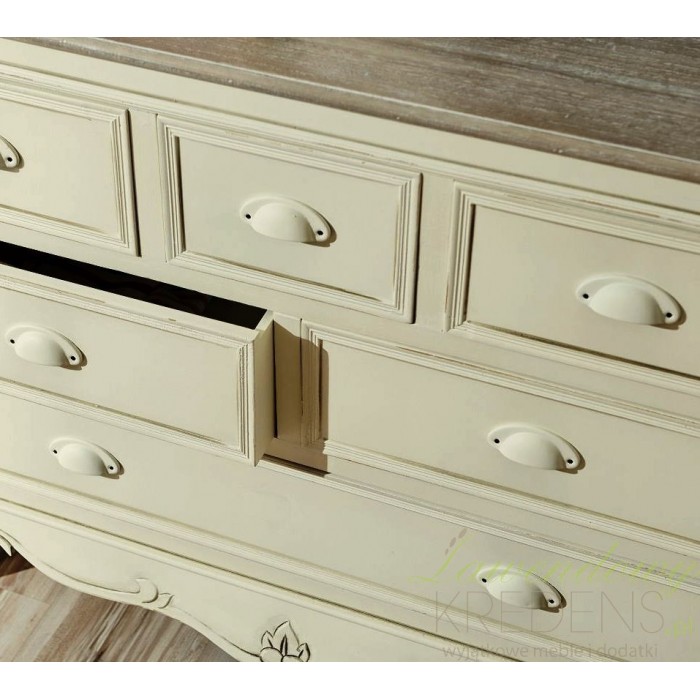 Elegancka komoda w stylu francuskim z różnej wielkości szufladami i bielonym blatem. Komoda wykonana jest z litego drewna topoli i ręcznie malowana na kremowa kolor. Nóżki komody mają piękny, zagięty kształt i ozdobione są rzeźbieniami. Do komody można dobrać inne meble w stylu francuskim z tej samej kolekcji.