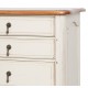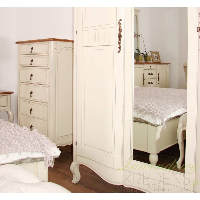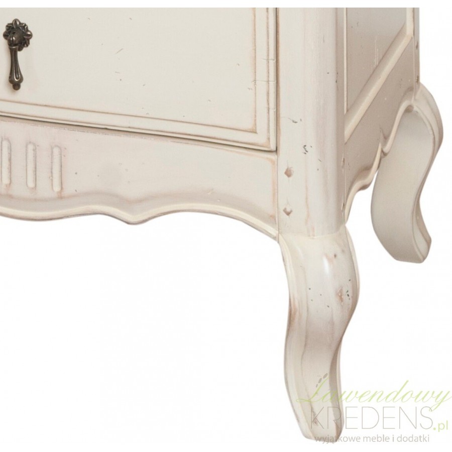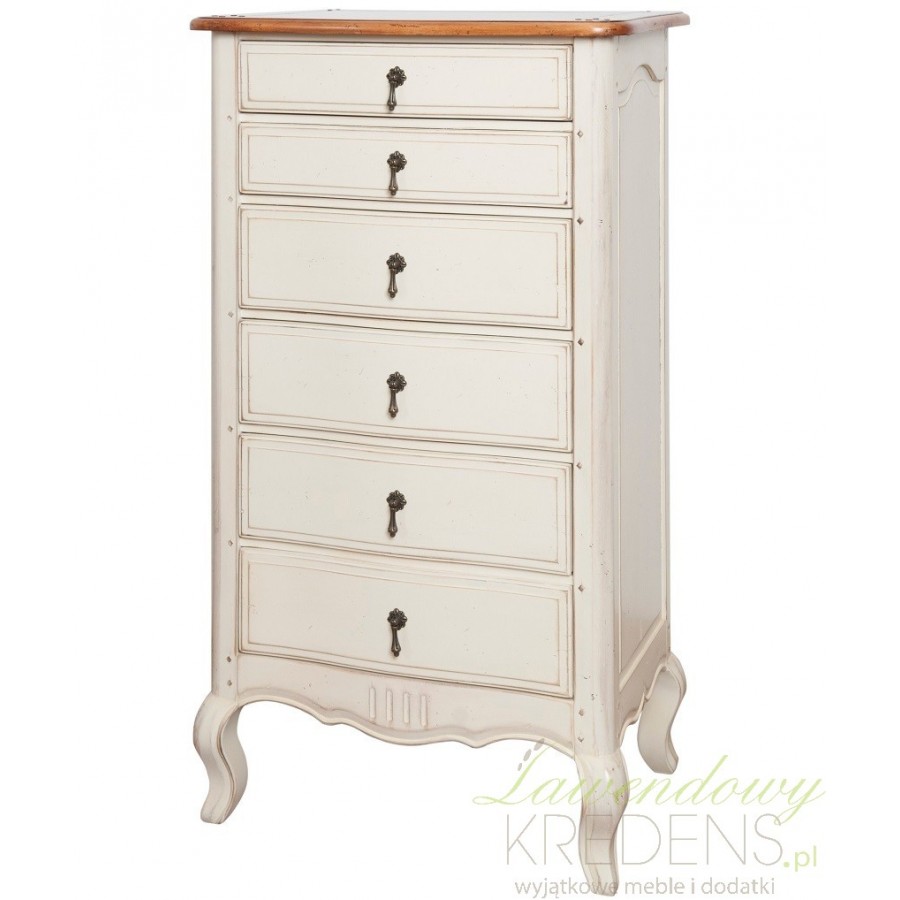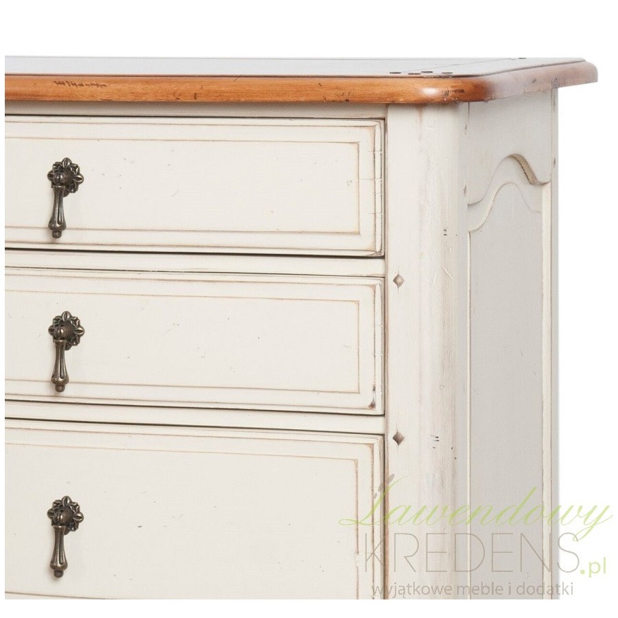 Kremowa komoda francuska, której pozazdroscić mógłby sam król Francjiza czasó swego panowania. Wąska komoda w stylu francuskim z blatem w kolorze naturalnego drewna, posiadająca liczny ślady postarzeń na całej powierzchni, bezbłędnie oddaje klimat XVIII wieku, ale także doskonale współgra z nowszymi wystrojami!