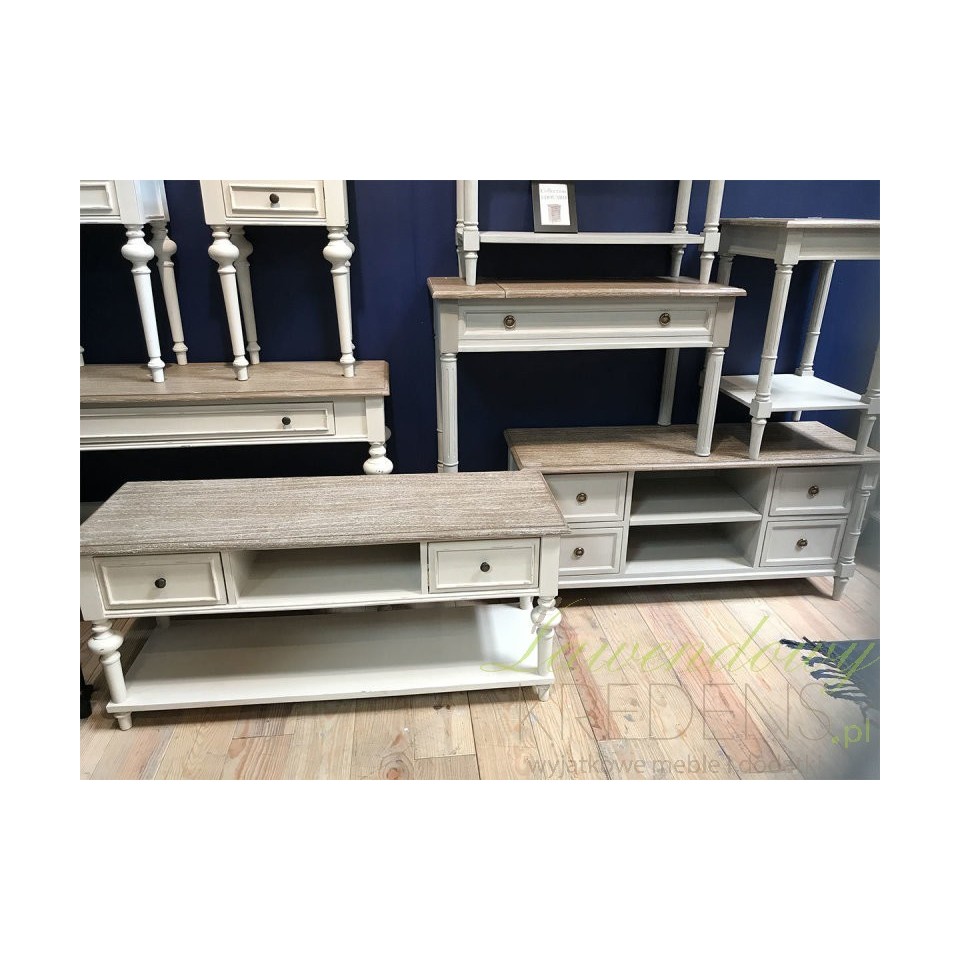 Charakterystycznie postarzana komoda prowansalska dedykowana pod telewizor i niezbędne sprzęty rtv, któe zapewnią rozrywkę i zabawę wszytskim domownikom. Półka z otworami na kable, dwie pojemne szuflady i szeroka półka na dole to duża przestrzeń do wykorzystania, dzięki któe wszytsko będzie w jednym miejscu, pod ręką. Meble przecierane z kolekcji Livio to oferta właśnie dla Ciebie!