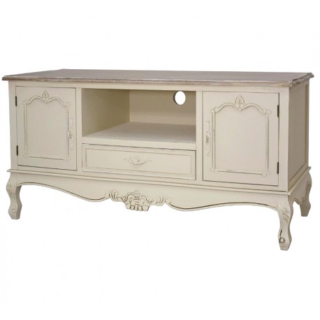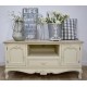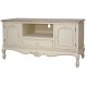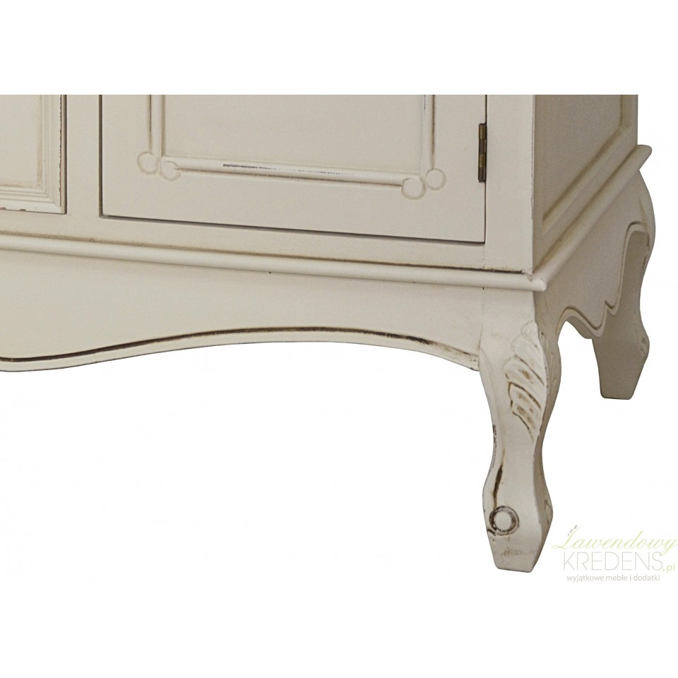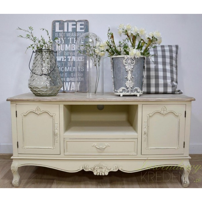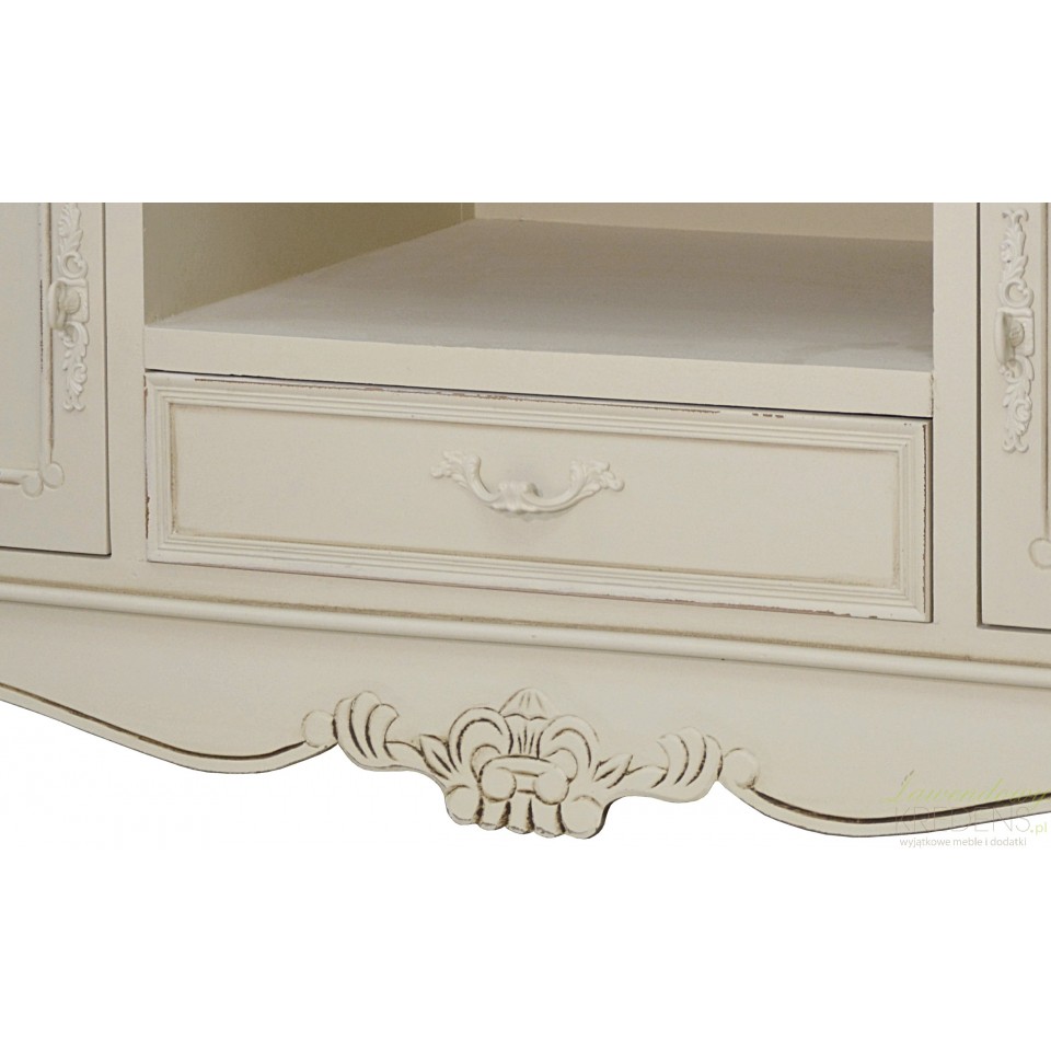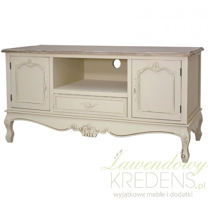 Kremowa komoda RTV w stylu prowansalskim z dwiema szafkami i szufladą. Piękny mebel z wysublimowanymi rzeźbieniami na krawędziach i prostokątnym, bielonym blatem jest idealny pod telewizor. Pod blatem znajduje się przestrzenna szuflada, na której można ustawić również inny sprzęt elektroniczny. Dekoracyjny i przepełniony francuskim designem mebel świetnie sprawdzi się w salonie lub w pokoju gościnnym.