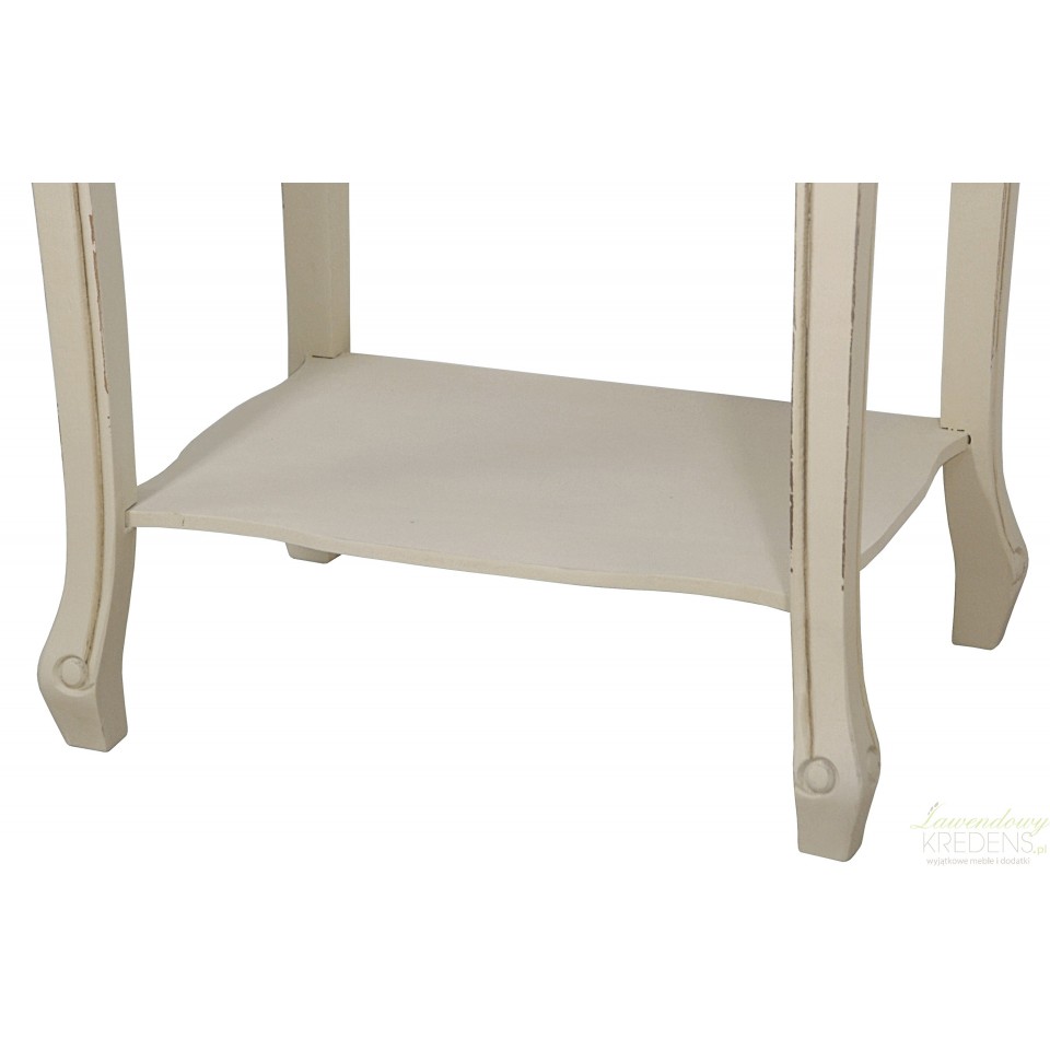 Kremowa szafka w stylu prowansalskim z bielonym blatem i postarzeniami, to jeden z mebli, który podkreśli piękno aranżacji zainspirowanych francuskim designem.