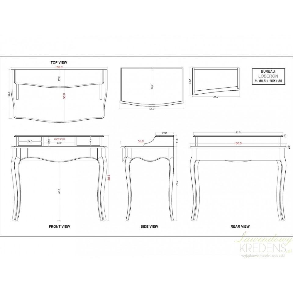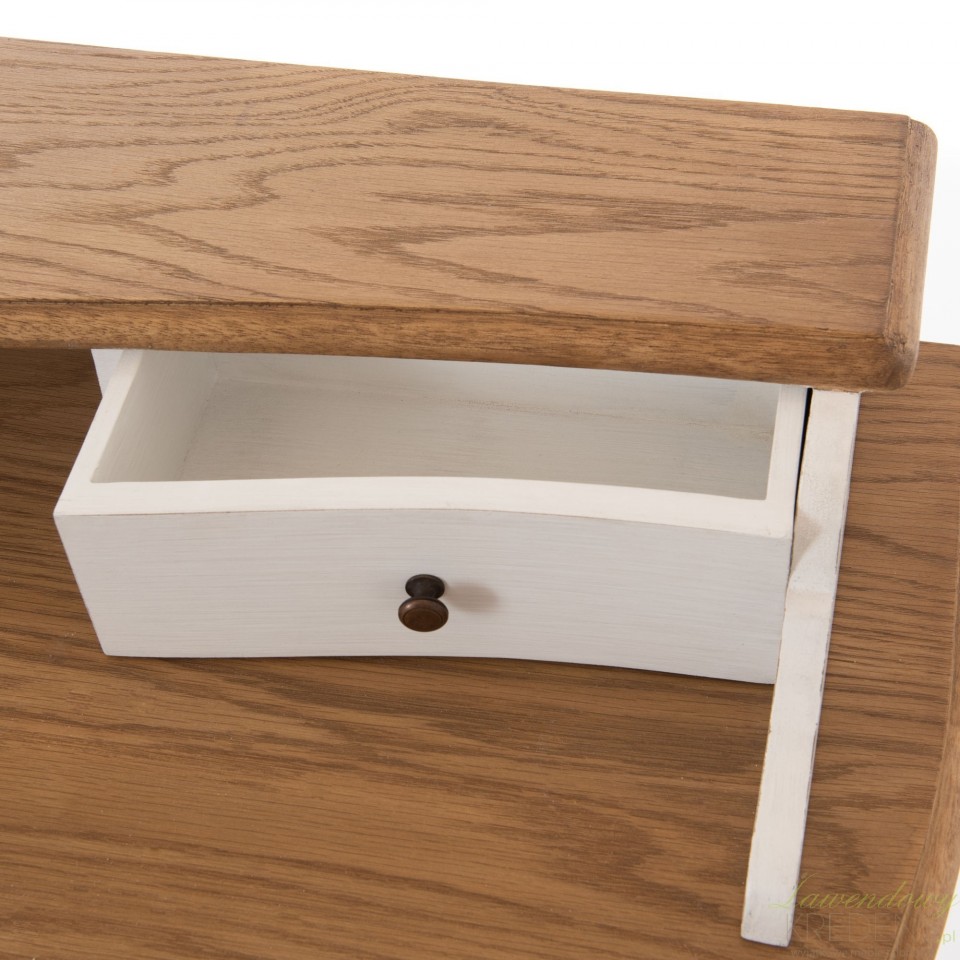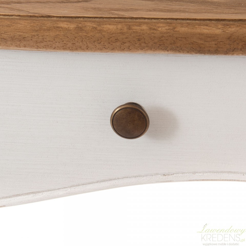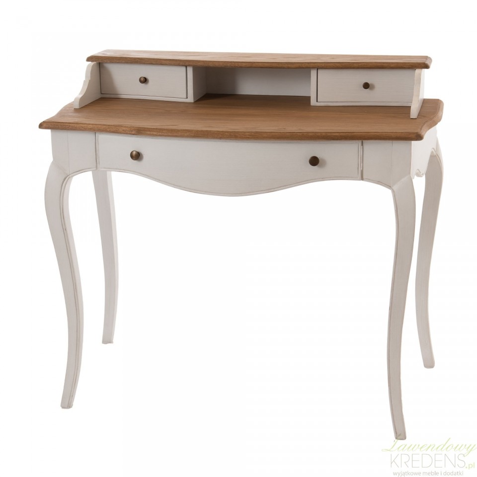 Dzięki przemyślanemu projektowi ten sekretarzyk prowansalski Luberti o delikatnych liniach oferuje wystarczająco dużo miejsca na przechowywanie korespondencji, teczek i innych artykułów biurowych. Posiada trzy szuflady z okrągłymi uchwytami, a także wnękę i długą nadstawkę umieszoną nad blatem. Zakrzywione nogi, zaokrąglone boki i uroczy cokół są zdecydowanie zainspirowane francuskim designem. Powierzchnia blatu w naturalnym kolorze drewna bardzo ładnie kontrastuje z całością. Wybierz biurka prowansalskie i urządź wymarzone miejsce pracy. Te i inne meble prowansalskie znajdziesz w naszym sklepie online.