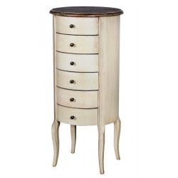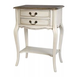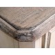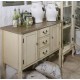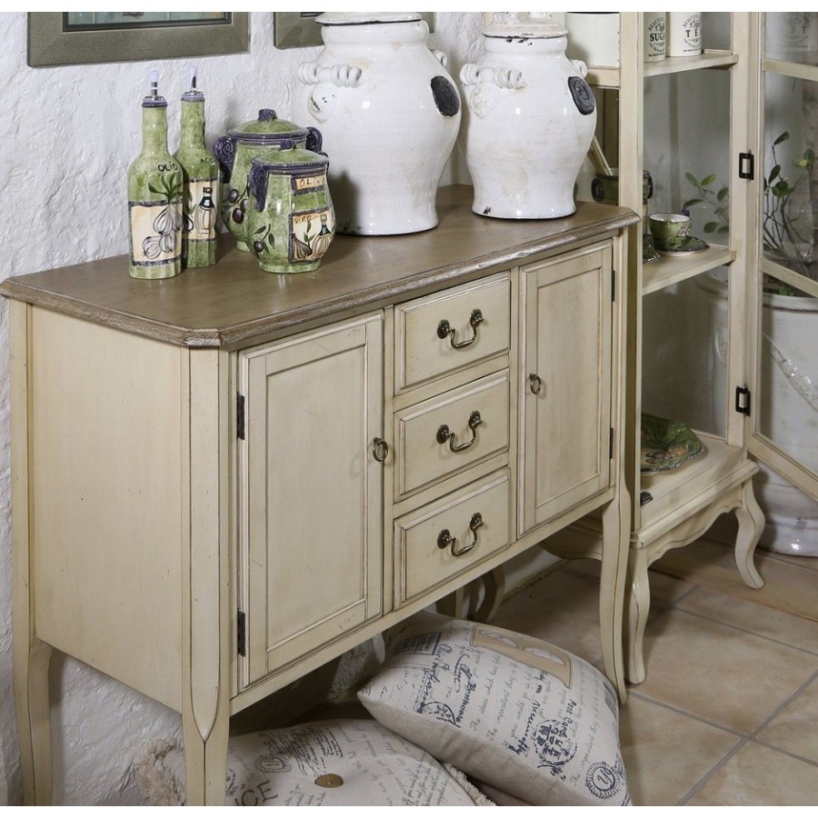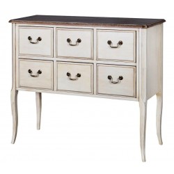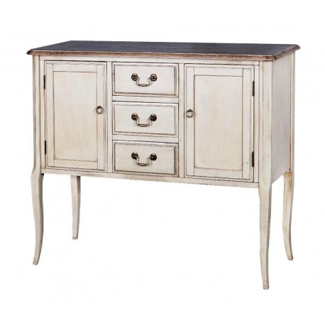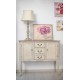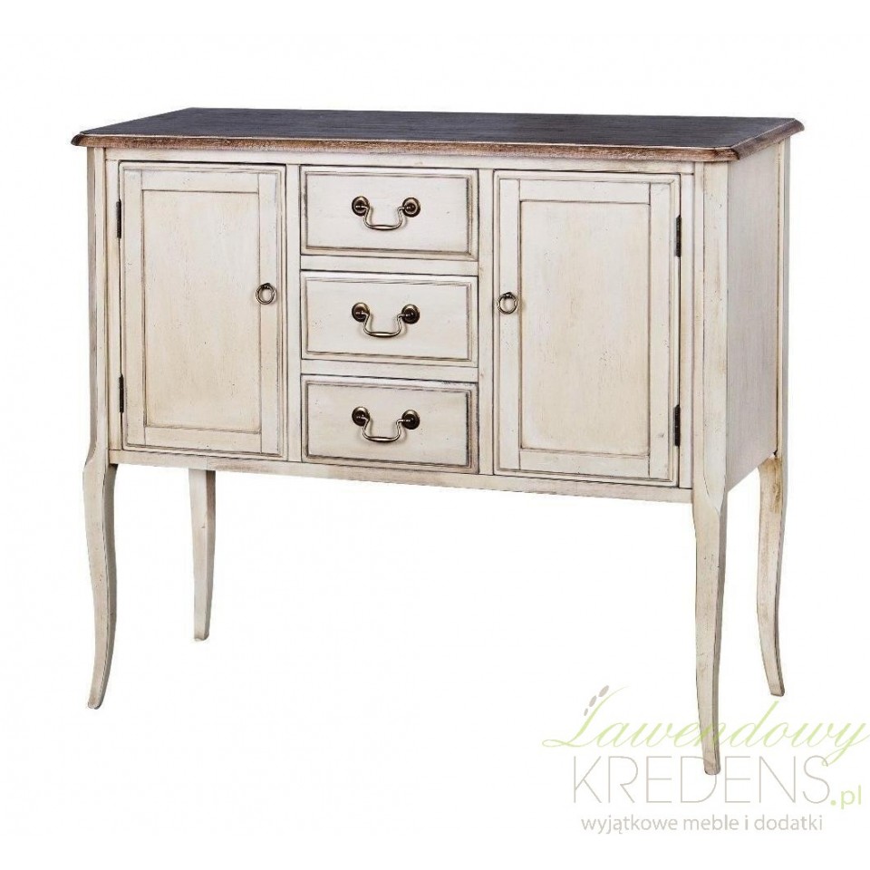 Beżowa barwa ręcznie malowanej komody, miejscami celowo ocierana, aby sprawiała wrażenie upływu czasu, kontrastuje ze szczotkowanym blatem w kolorze brązu. Praktyczne szafki po bokach i trzy szuflady w środkowej części komody. Całość wsparta na wywijanych, zgrabnych nogach.