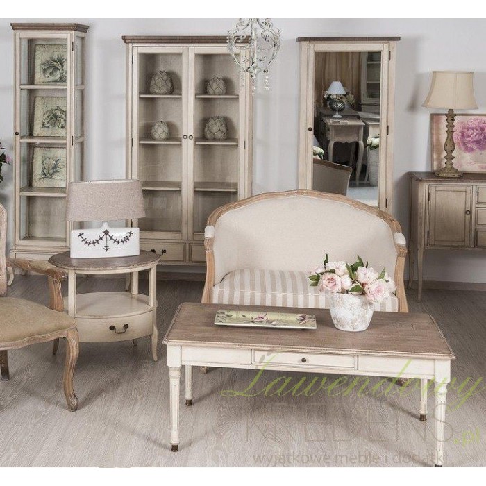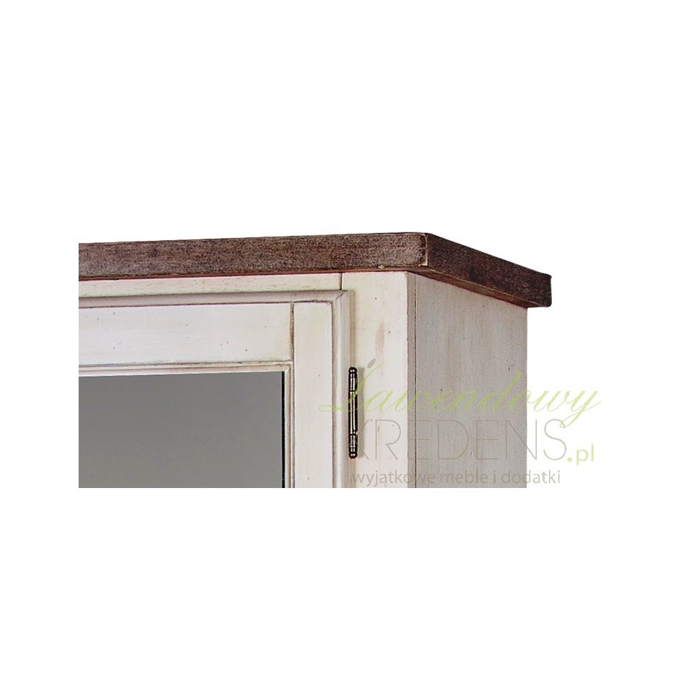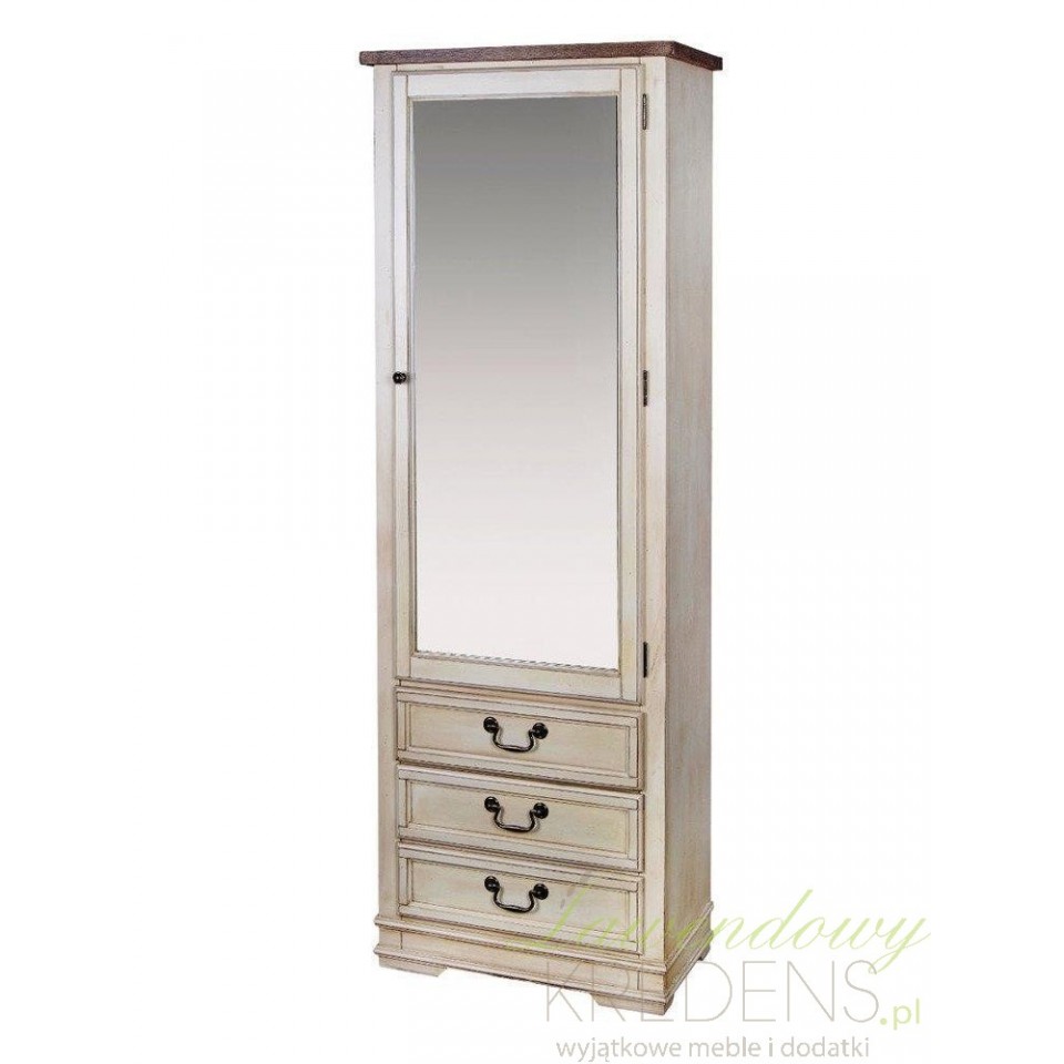 Stylowa szafa w stylu prowansalskim w kolorze kremowym, z lustrem optycznie powiększającym wnętrze.