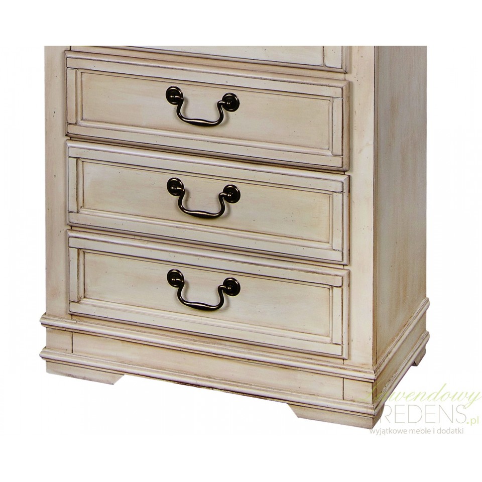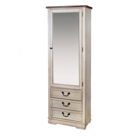 Szafa w stylu prowansalskim, która została wykonana z wytrzymałego i silnego drewna kauczukowego i która została ręcznie pomalowana, to świetne rozwiązanie do niewielkiej sypialni. Wszytsko dzięki wkomponowaniu we frontowe drzwi dużego lustra, które optycznie powiększy pomieszczenie. Szafa posiada dodatkowo trzy pojemne szuflady, całość wykończona metalowymi uchwytami.