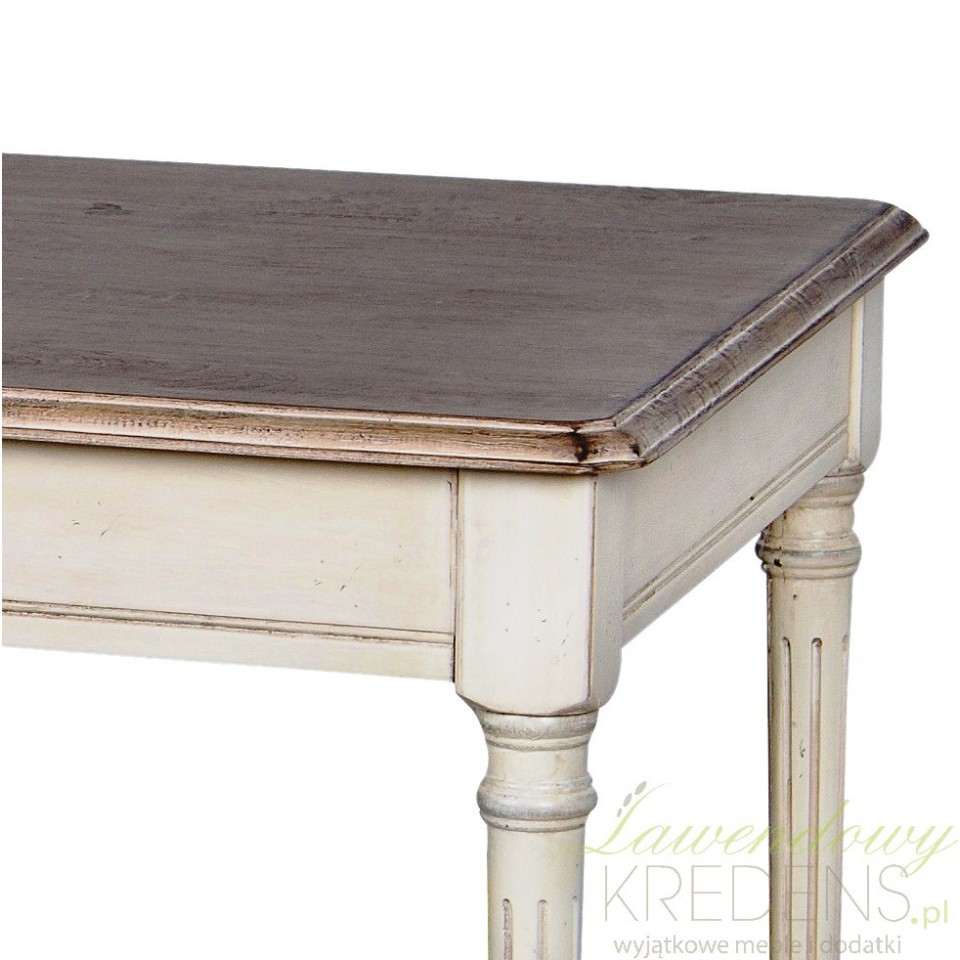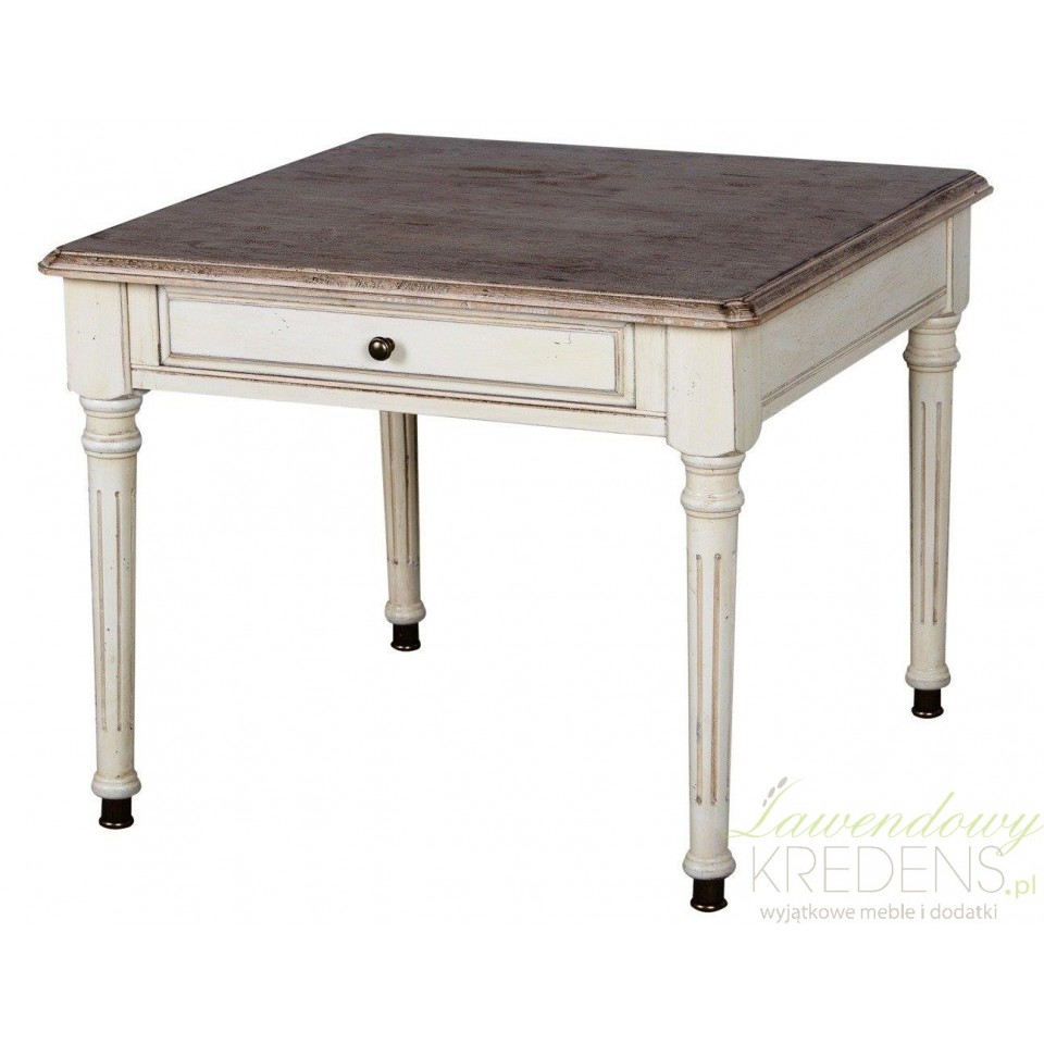 Fantastyczny, utrzymany w jasnej, kremowej kolorystyce stolik w stylu prowansalskim o kwadratowym blacie.