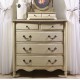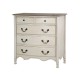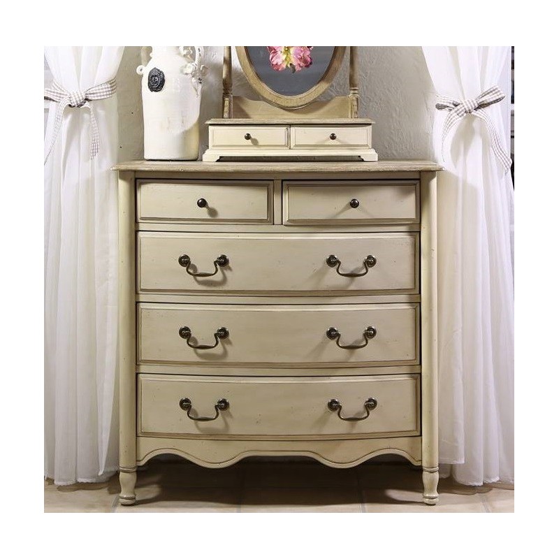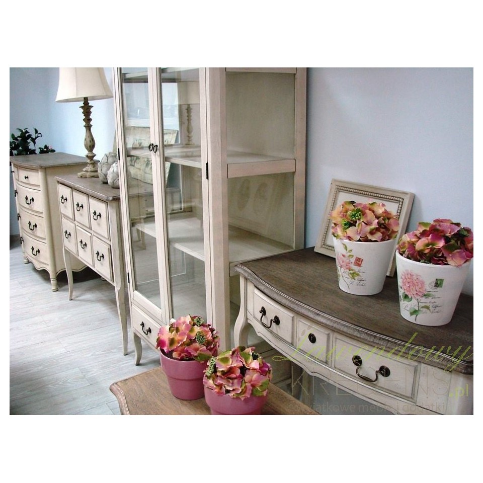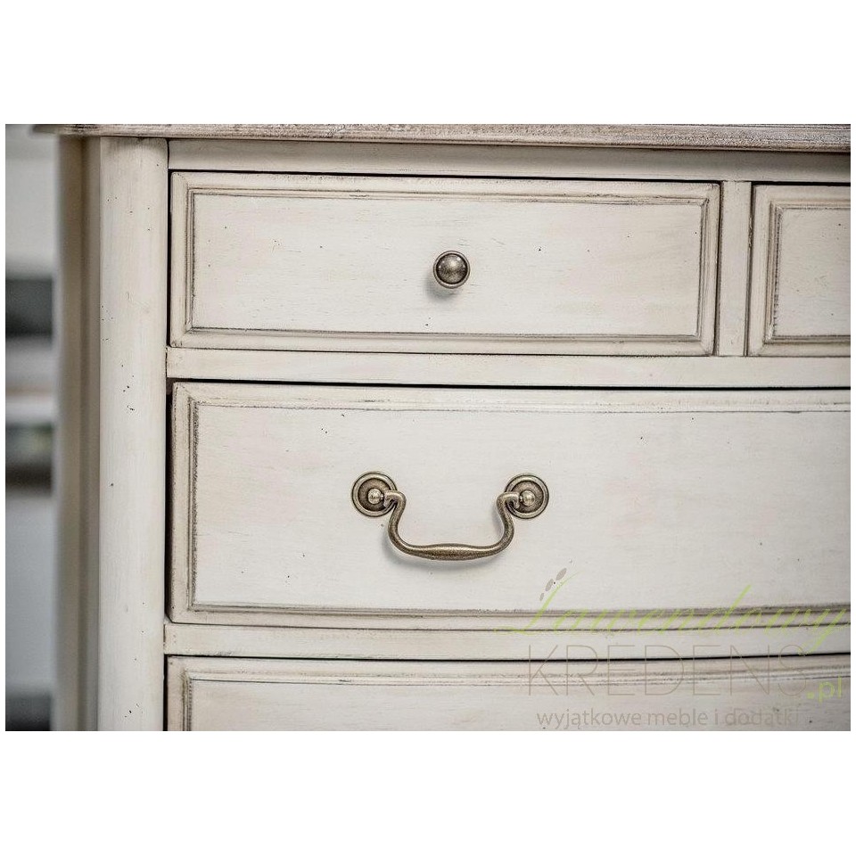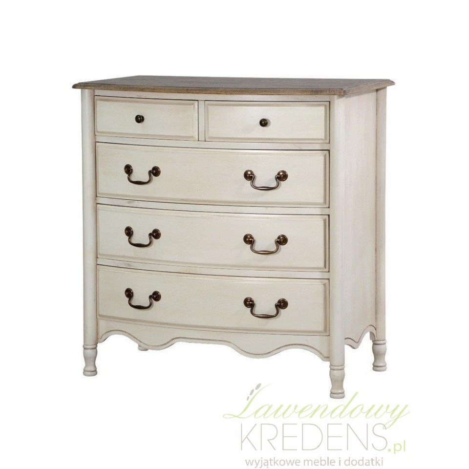 Komoda prowansalska, wykonana z drewna i postawiona na ładnie wykończonych nóżkach to klasyczny mebel o dużej pojemności. Komoda posiada trzy duże szuflady z poręcznymi, ładnie wyglądającymi uchwytami oraz dwie mniejsze szufladki o okrągłych uchwytach. Komoda posiada wyjątkowo piękny falisty wzór zdobniczy, umieszczony w dolnej części mebla. Meble prowansalskie - polecamy!