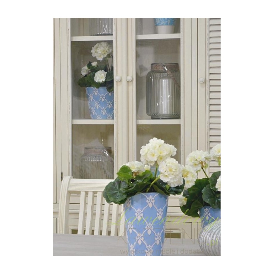 Kremowa witryna firmy Livin Hill wykonana jest z litego drewna topoli i płyty MDF. Witryna prowansalska zbudowana jest z mniejszych i większych szafeczek, odpowiednio z zakrytymi frontami lub drzwiczkami z szybą. Dodatkowym atutem witryny jest jej ręczne malowanie. Meble prowansalskie, a wśród nich witryny to doskonały sposób na to, by twój pokój zajęły meble interesujące i oryginalne.
