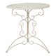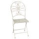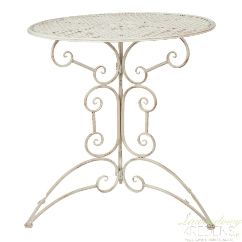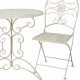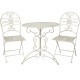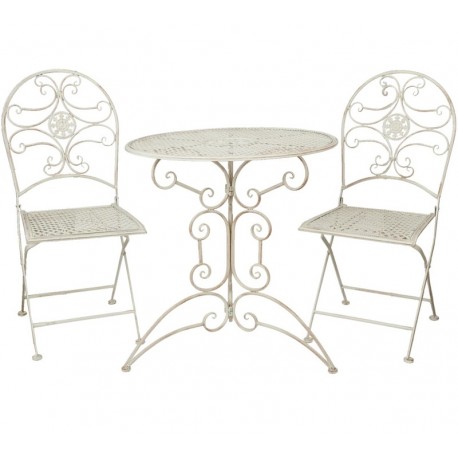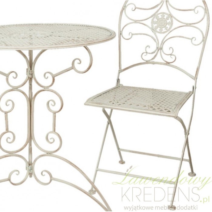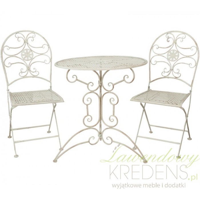 Wyjątkowe meble ogrodowe w skład których wchodzi metalowy stół o okrągłym blacie oraz mocno zdobioną podstawą, a także dwa składane krzesła z kratkowanym siedziskiem i ozdobnym oparciem. Meble do ogrodu to czarodziejskie dodatki, które podkreślą klimat prowansalski.