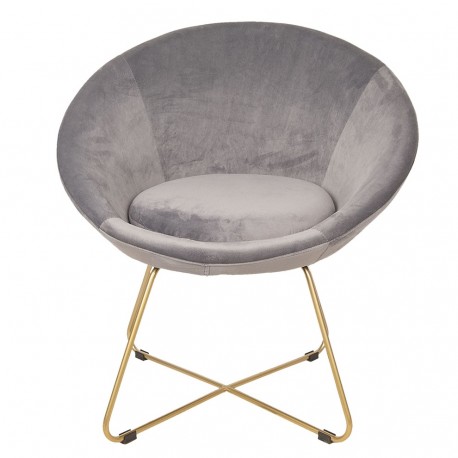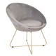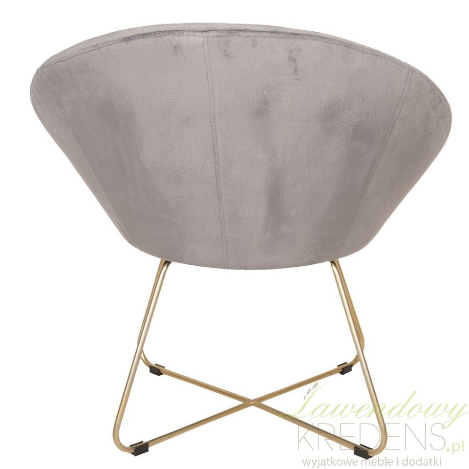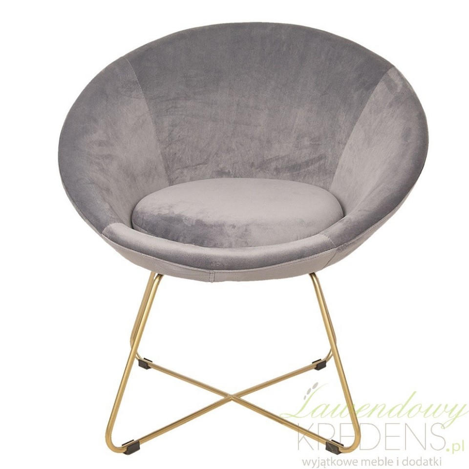 Eleganckie krzesło w stylu prowansalskim z wygodnym, zaokrąglonym oparciem ma szary kolor tapicerki i metalową podstawę w kolorze złota.