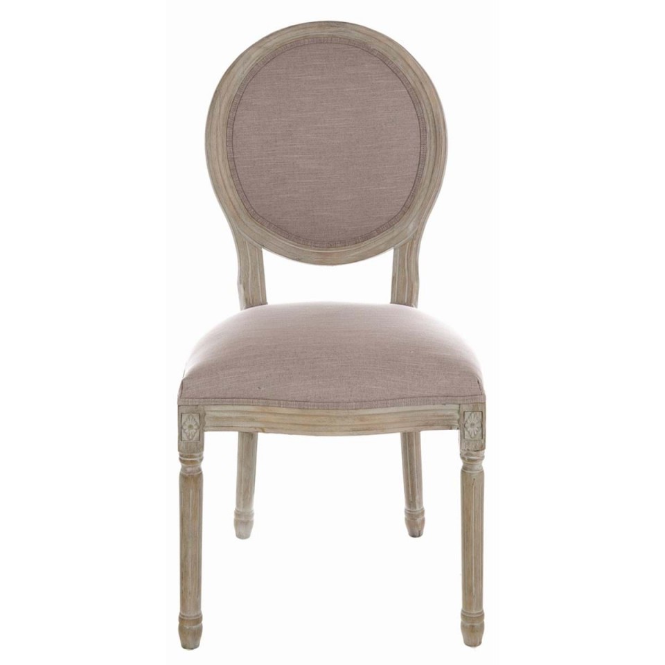 Miękkie, pikowane siedzisko pokryte jasną, subtelną tkaniną zapewnia wygodę podczas siedzenia, a zaokrąglone oparcie w kształcie medalionu nie tylko nawiązuje do klasycznego stylu ludwikowskiego, ale także pięknie eksponuje całość formy mebla. To właśnie ten detal nadaje krzesłu wyjątkowy charakter i sprawia, że staje się ono ozdobą każdej przestrzeni.